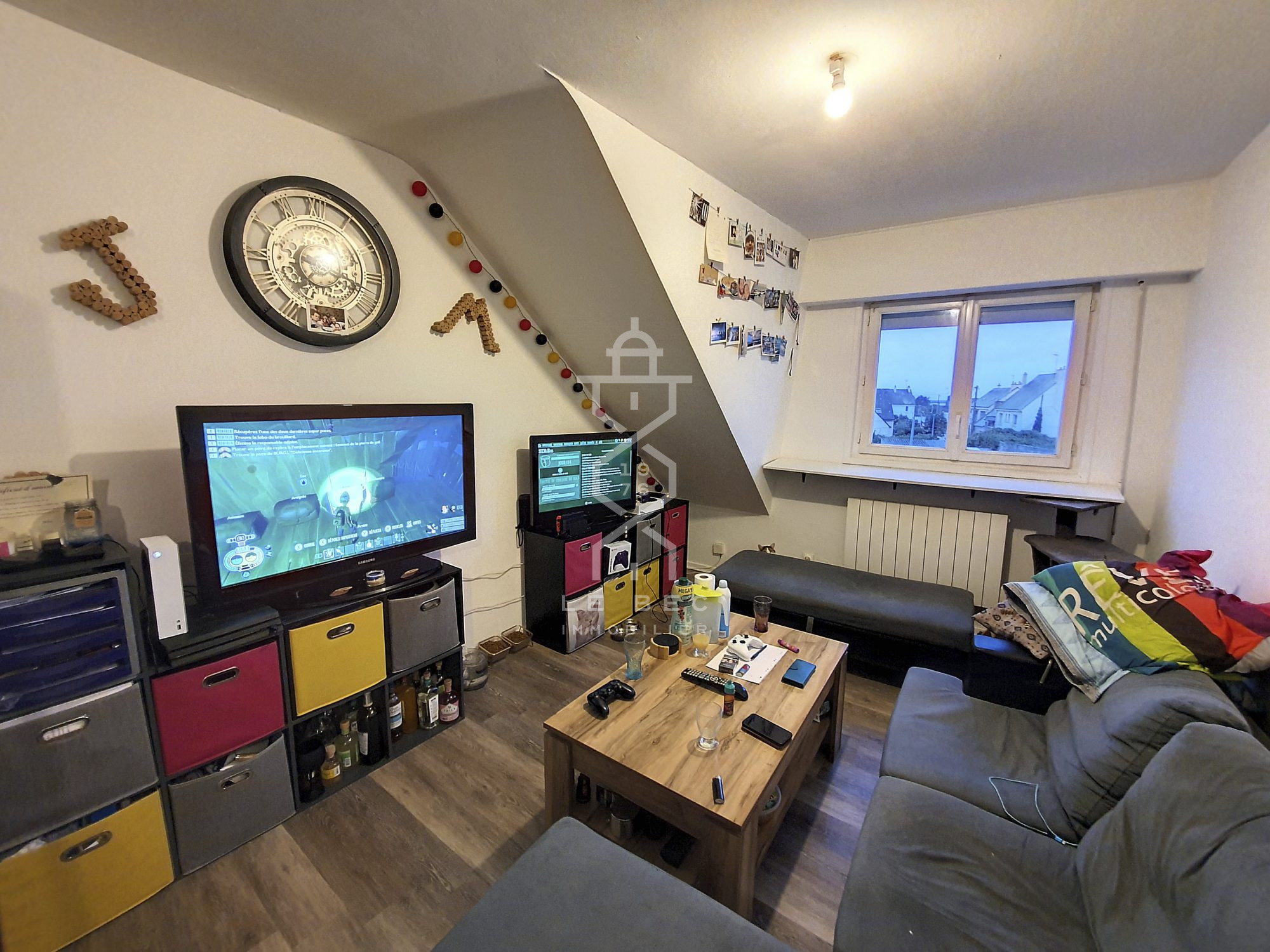 Au rez-de-chaussée : un appartement T2 avec salon séjour, cuisine, chambre, salle d'eau et terrasse. Loué 445? par mois. Bail non meublé en cours.