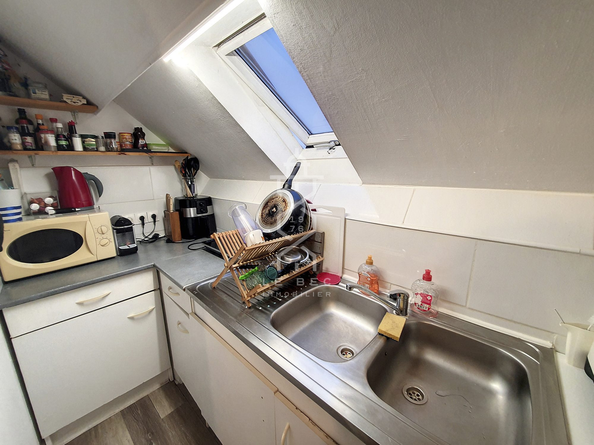 Au deuxième étage : Un appartement T2 avec salon séjour, cuisine, salle d'eau avec WC, une chambre. Loué 390? par mois.