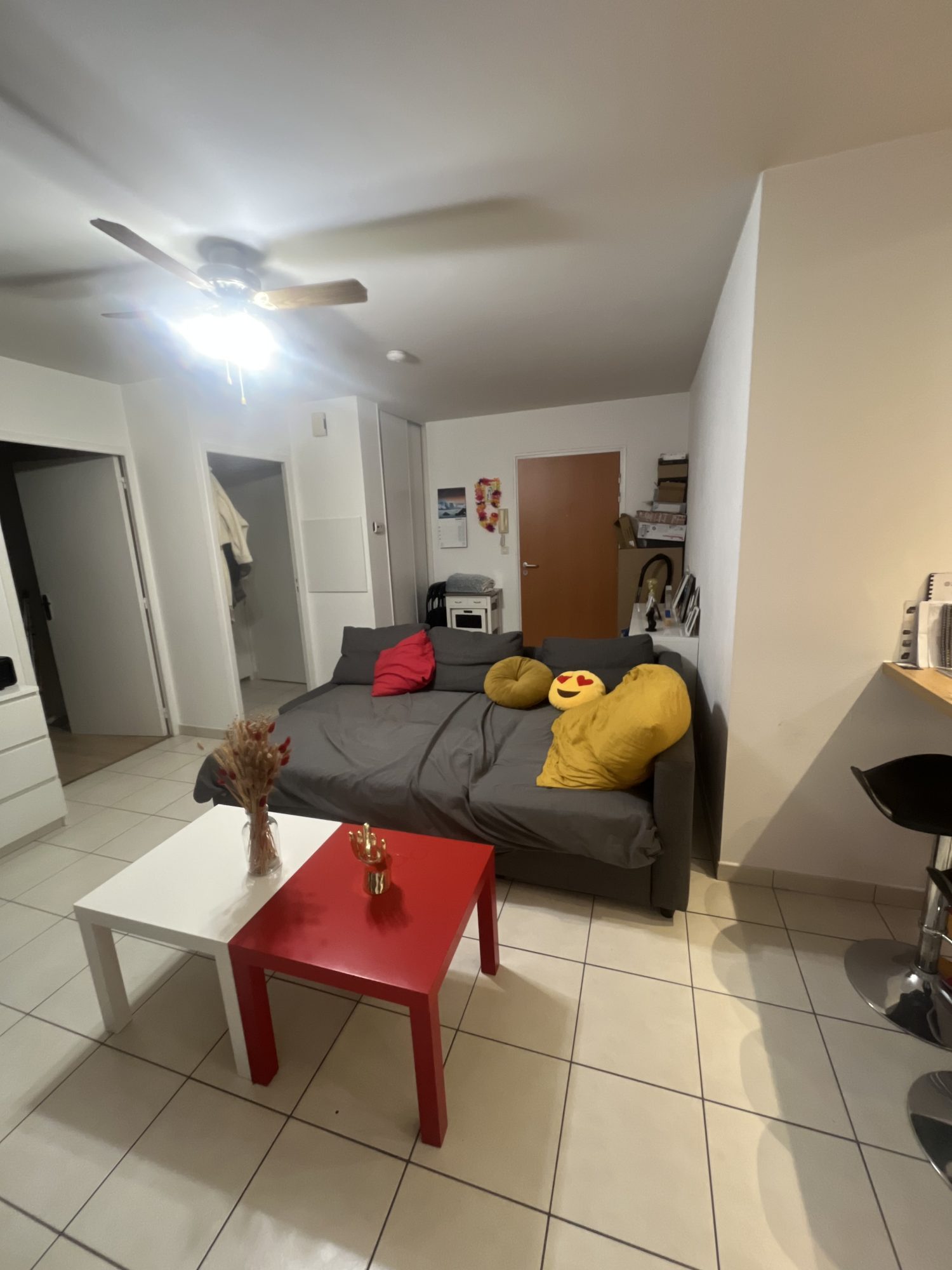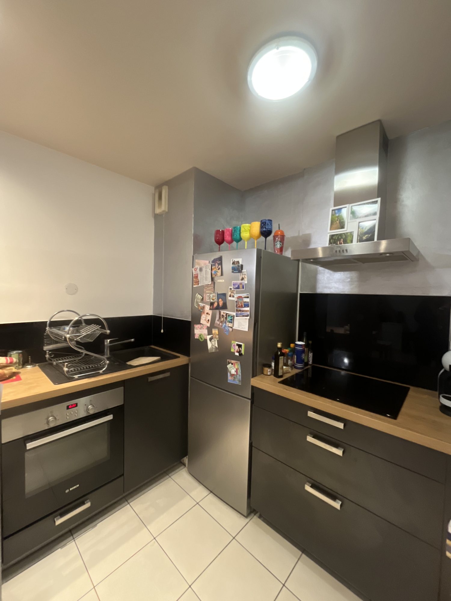 Une Entrée avec placard, un séjour avec balcon, une cuisine entièrement aménagée et équipée ( réfrigérateur, congélateur, plaque de cuisson, four) ouverte sur la pièce principale ,une chambre avec placard,