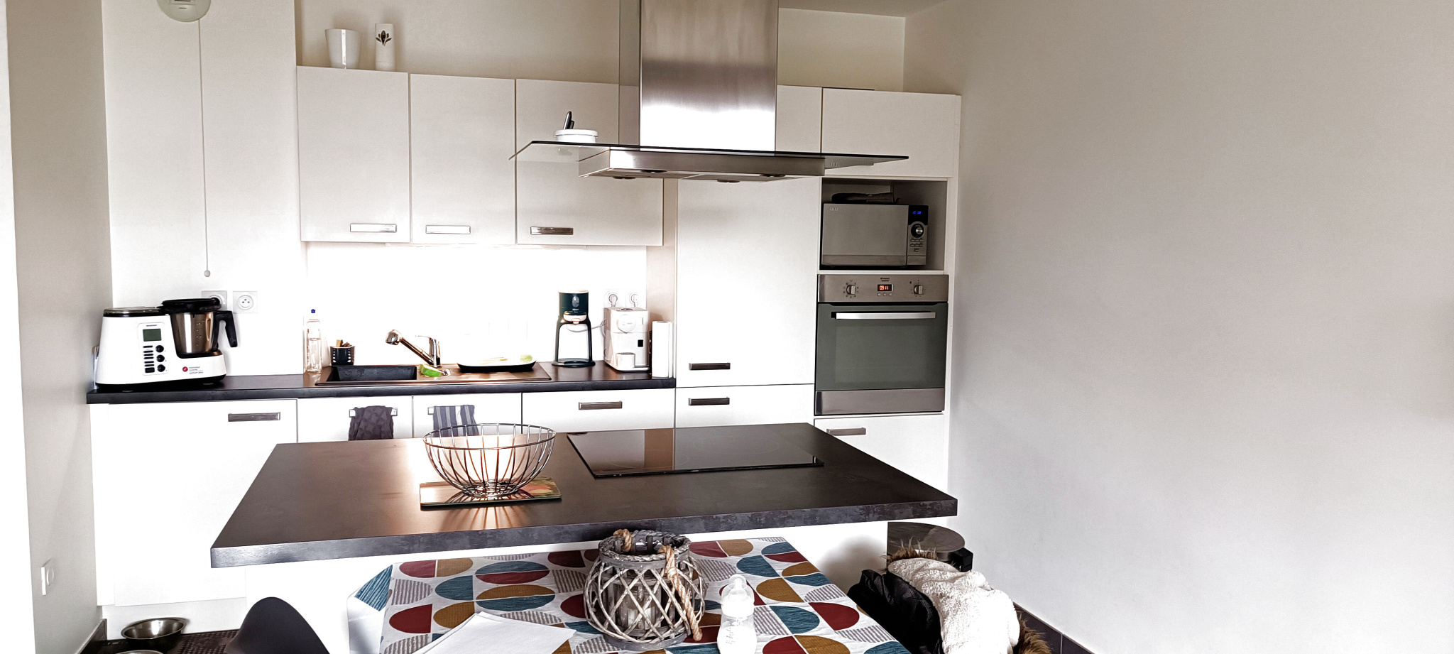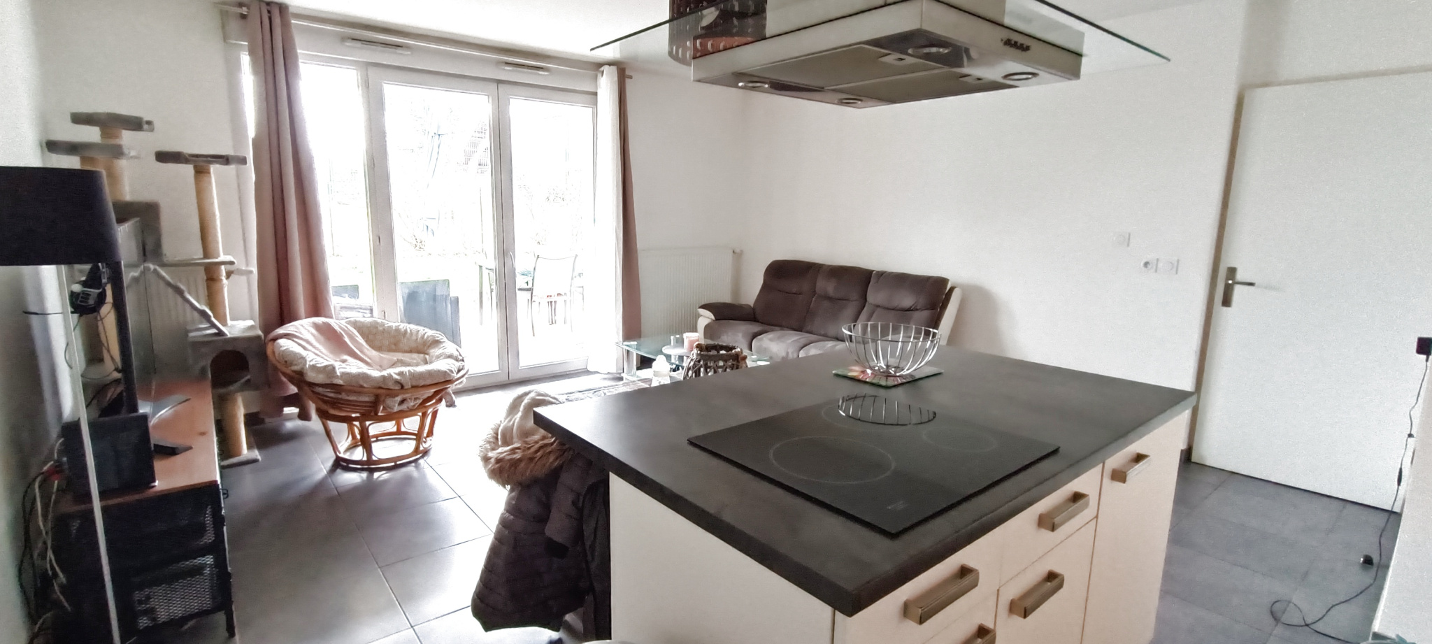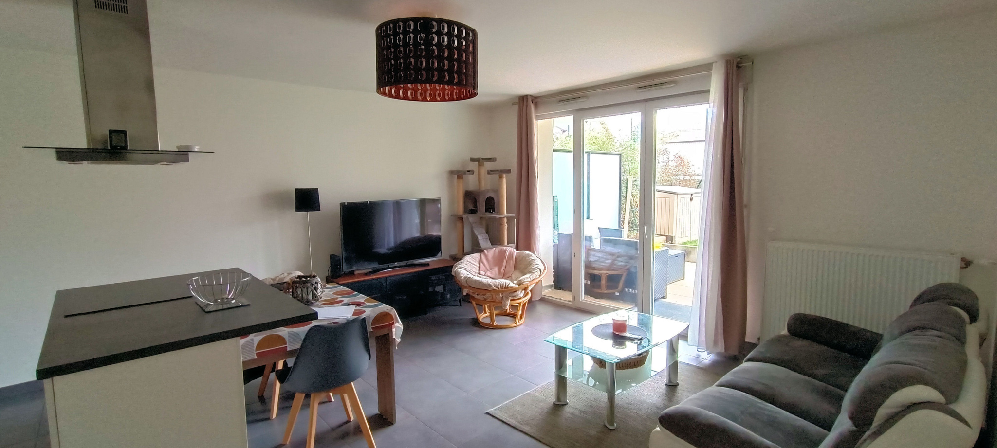 Cuisine équipée ouverte sur salon séjour donnant sur terrasse et jardin de 80 m2, salle de bains , WC séparé, buanderie, deux chambres.