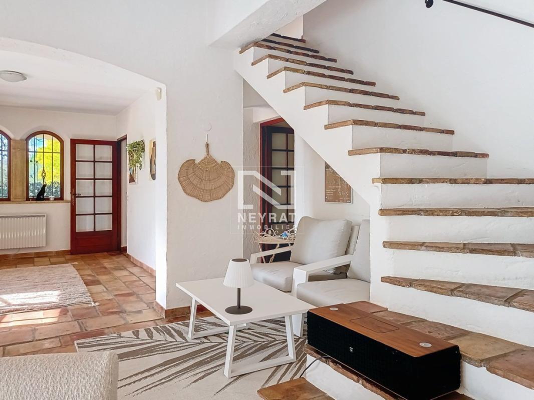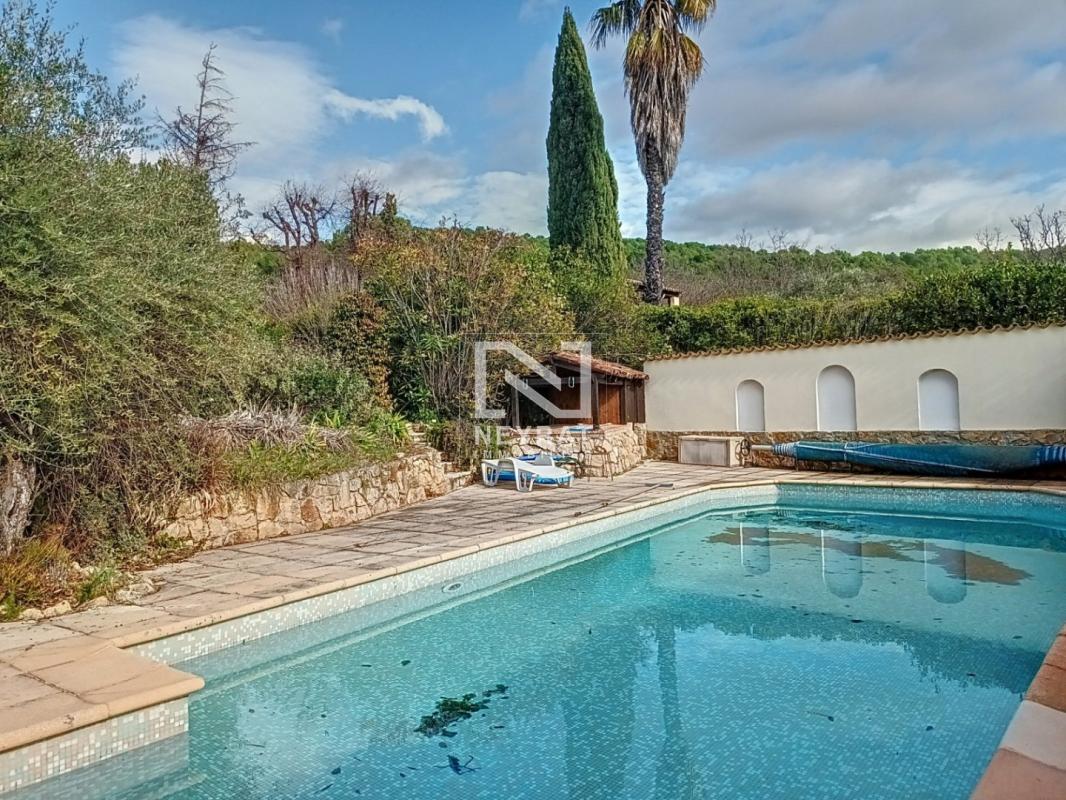Tourrettes : Superbe emplacement au calme absolu et proches commodités, très beau panorama pour cette belle villa provençale, 5 chambres, dont 4 de plain pied, grand séjour lumineux, 2 salles de bains, garage, buanderie, atelier, cave à vin. Magnifique espace piscine clos de mur, le tout dans un jardin méditerranéen avec vue dégagée. Belle maison de famille pleine de charme. Prestations de qualité. Bus scolaire à 20 m.