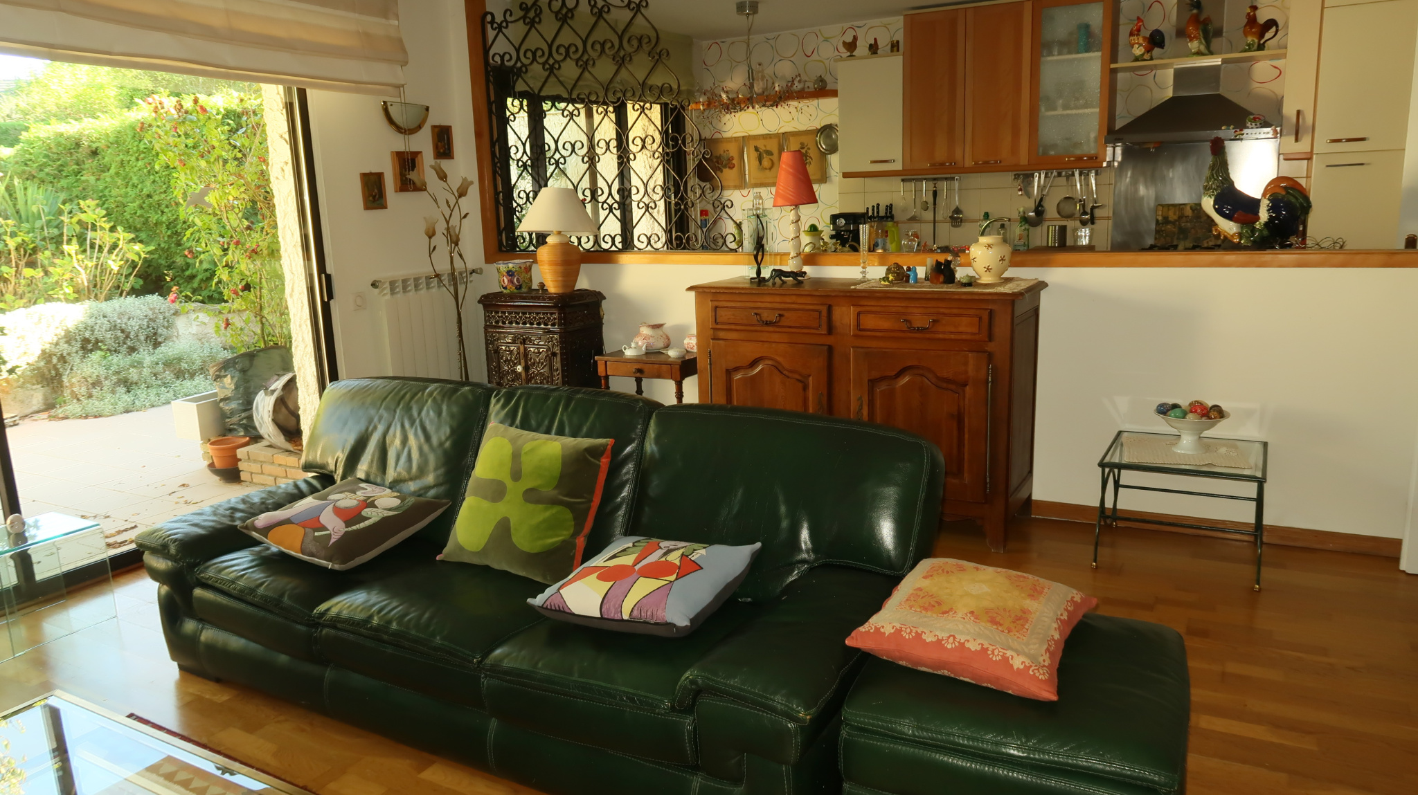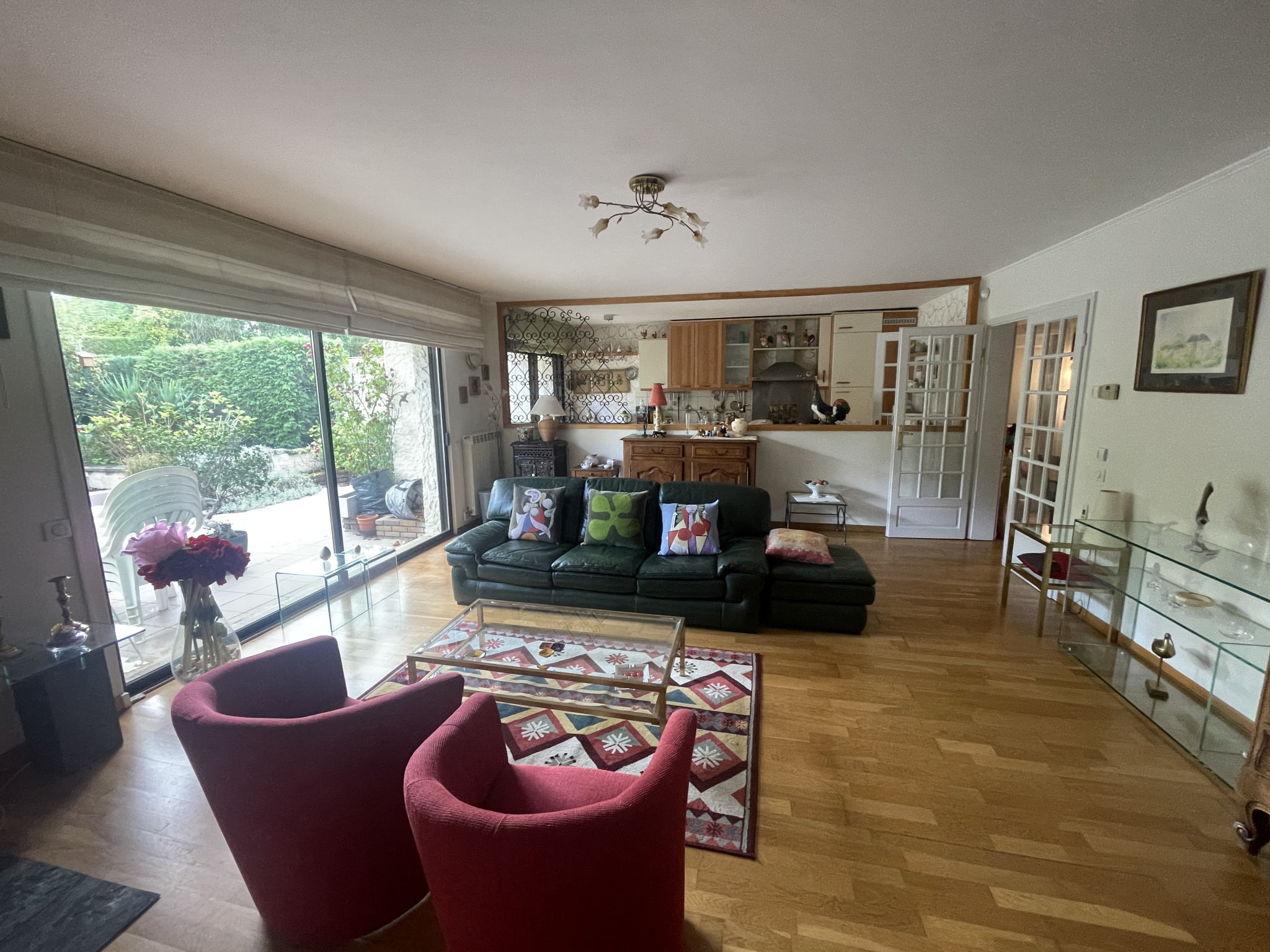 hall d'entrée, bureau, 3 chambres, lingerie, salle de bains, living room (30 m2) avec baie vitrée sur terrasse SUD-EST de 34 m2, cuisine 13 m2 ouverte sur le living room et accès terrasse et jardin clos, WC lave mains, cellier, nombreux placards