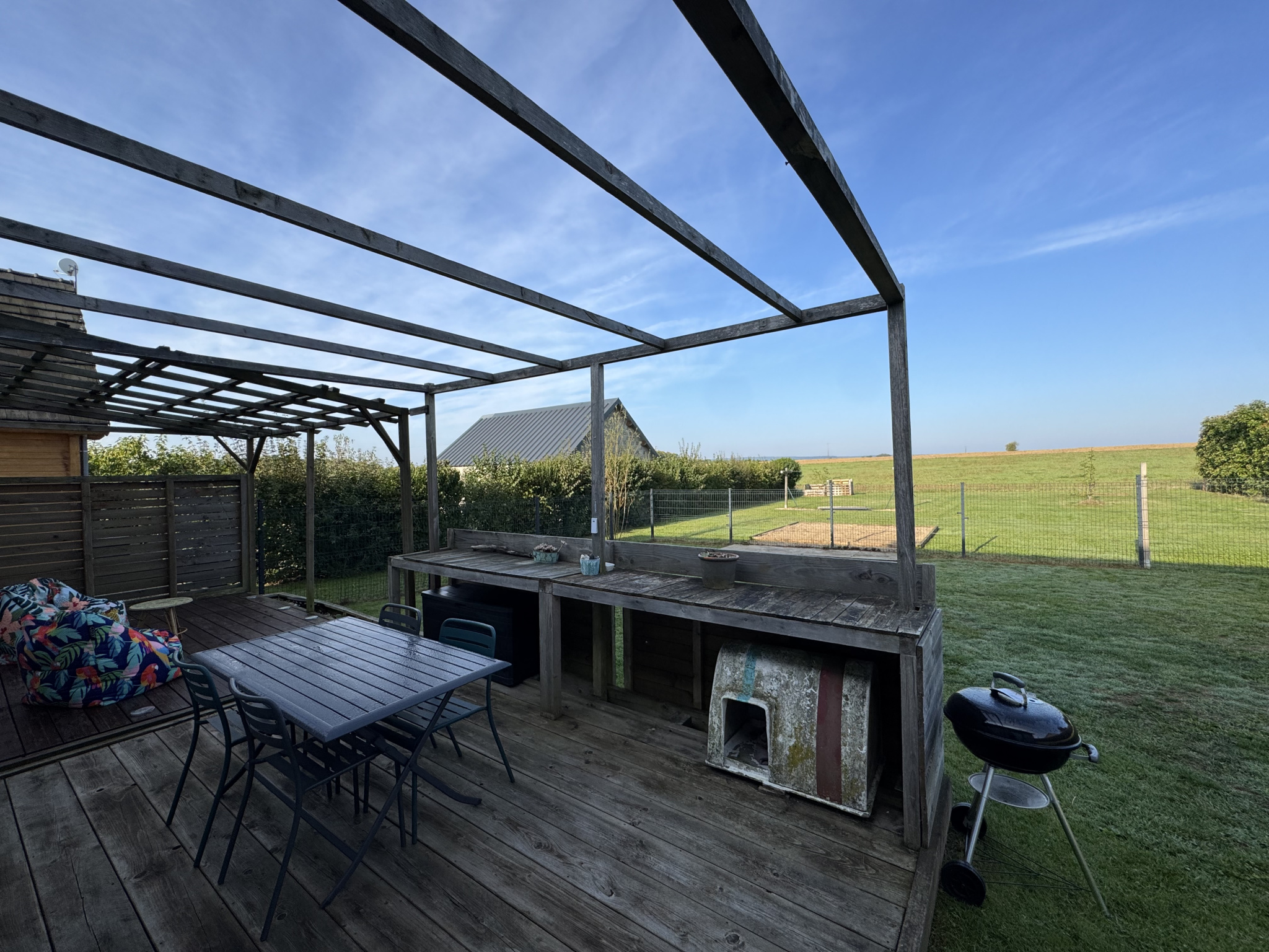 D'une surface habitable de 92,10 m2, la maison se compose au rez-de-chaussée d'une belle pièce de vie chaleureuse avec poêle à bois, ouverte sur une cuisine aménagée et équipée donnant accès à une terrasse en bois. Vous profiterez également d'une arrière-cuisine, d'un espace atelier/vélos avec bûcher, ainsi que d'une chambre de plain-pied avec placards intégrés répondant aux normes PMR. Une salle d'eau avec double vasque et un WC complètent ce niveau.