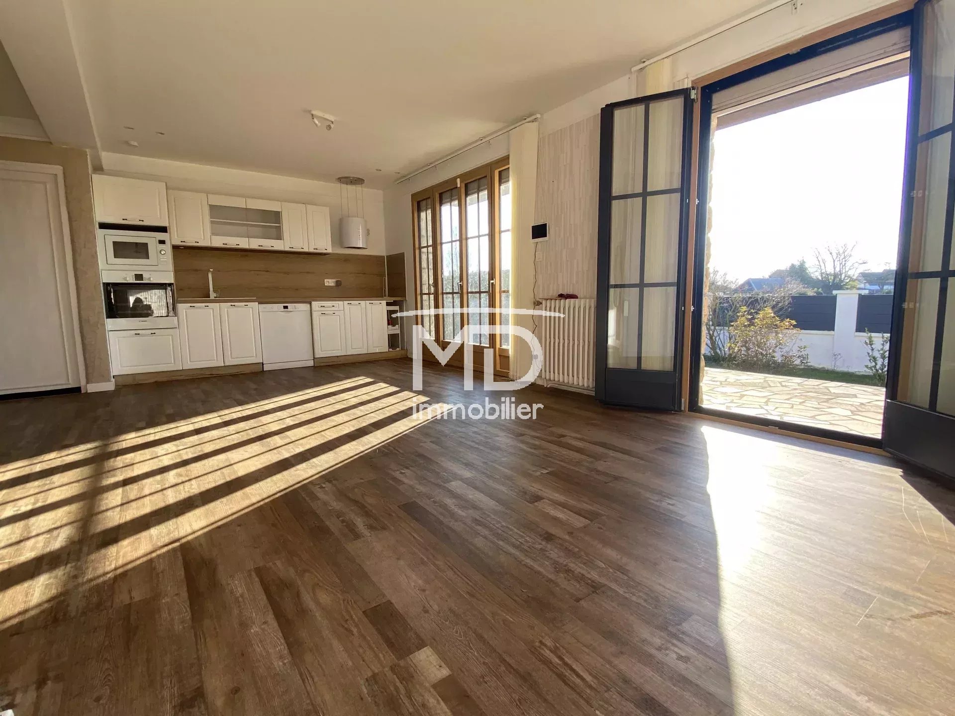 À l'extérieur, une terrasse et une charmante maisonnette d'environ 7m² aménagée en pièce bureau chauffée et isolée.