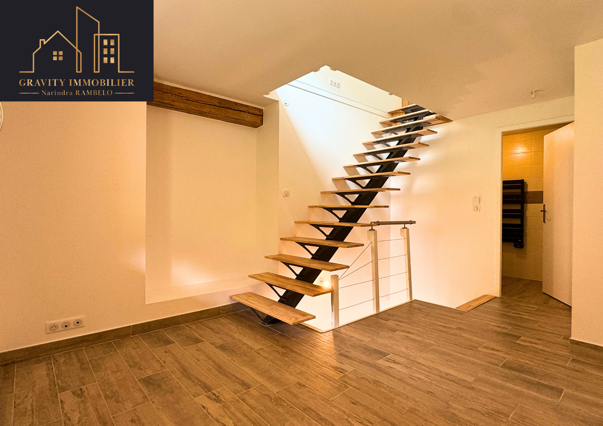 L'appartement se compose d'une entrée ouvrant sur un espace de vie lumineux avec accès direct aux extérieurs et d'une cuisine (existante sans éléctroménager), d'un pièce à vivre au 1er étage + salle d'eau et WC indépendants et au 2ème étage une chambre originale avec des espaces optimisés grâce à la configuration en triplex.