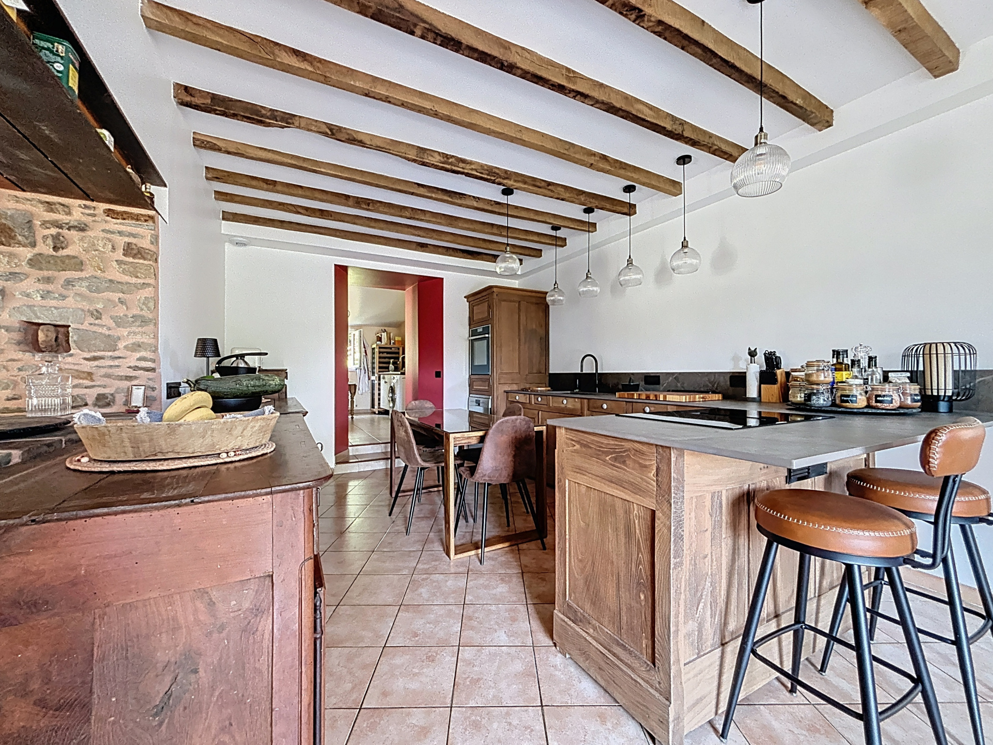 La maison se compose au rez-de-chaussée d'une entrée lumineuse, une cuisine rustique équipée de meubles de charme, avec arrière-cuisine et buanderie attenantes, un salon chaleureux avec pierres apparentes et insert, une salle à manger conviviale, également dotée d'un insert, un WC.
