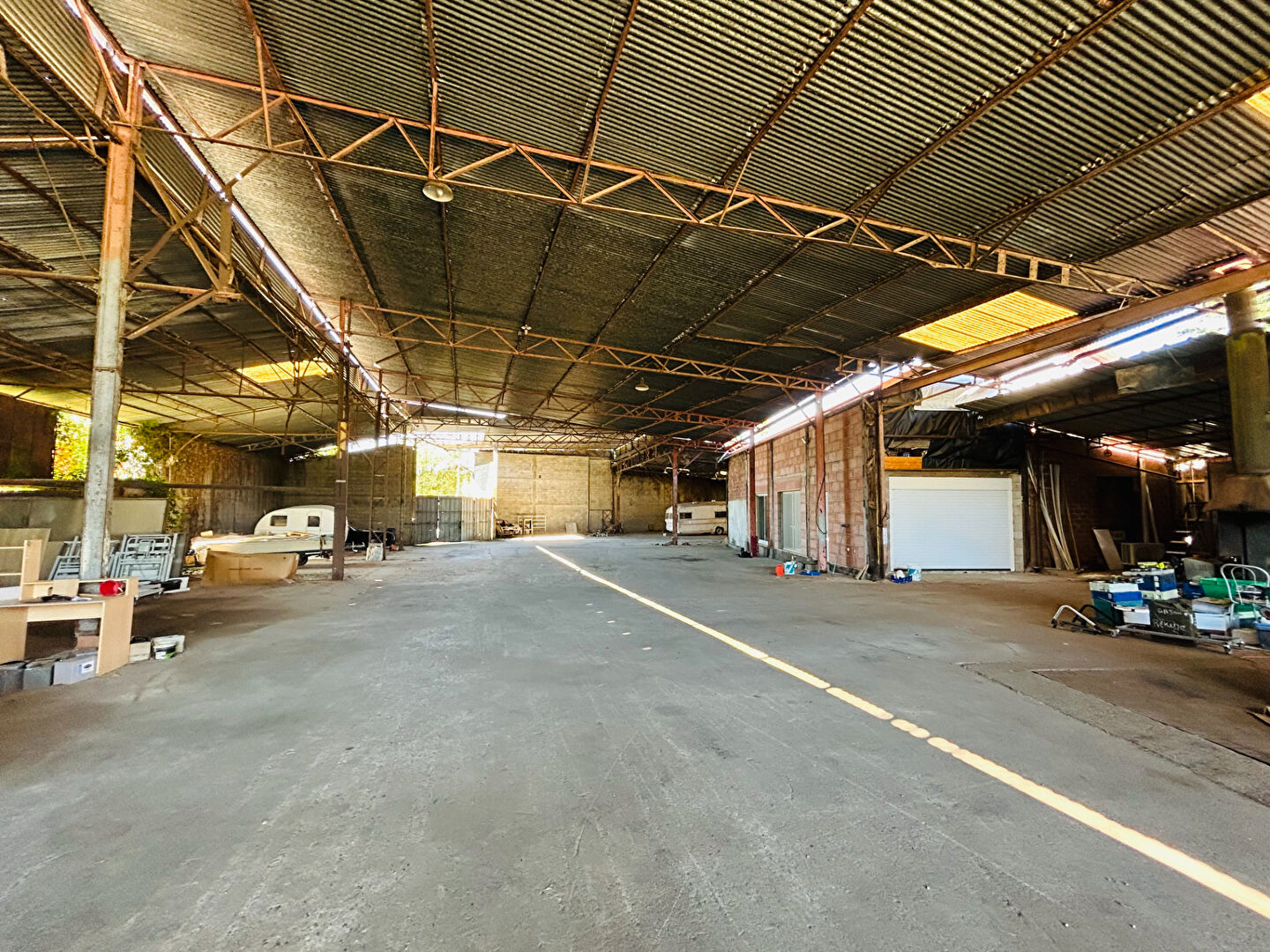 L'entrepôt complètement couvert possède deux entrées distinctes avec accès pour les poids lourds, une fosse pour la mécanique et d'un puits.