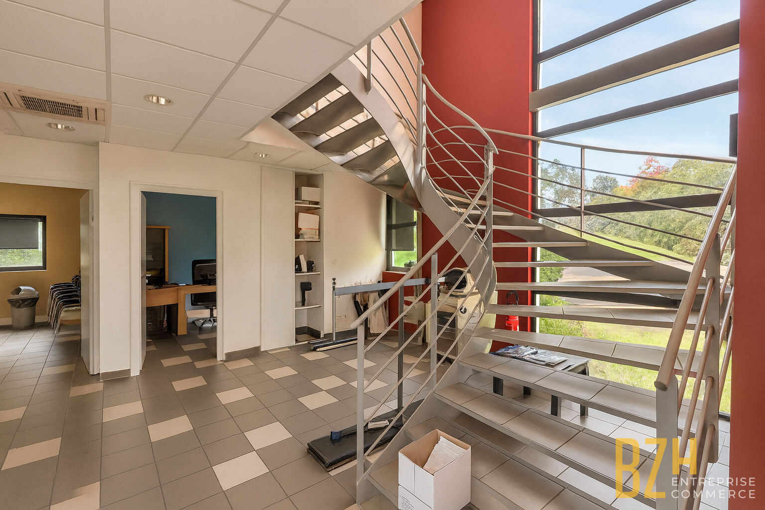 La partie bureaux, lumineuse et fonctionnelle, comprend au rez-de-chaussée : un accueil, une salle de réunion, une salle de repos, un bureau de direction et des sanitaires. À l'étage, un open-space, un bureau individuel et des sanitaires complémentaires complètent cet espace de travail prêt à l'emploi.