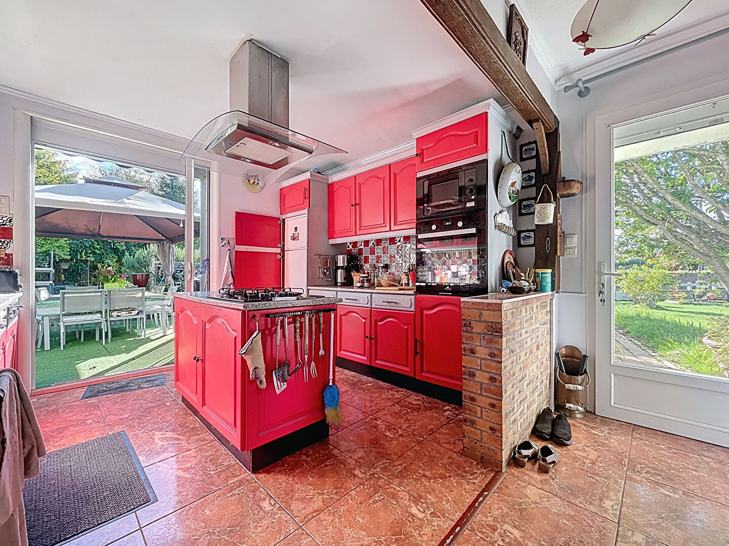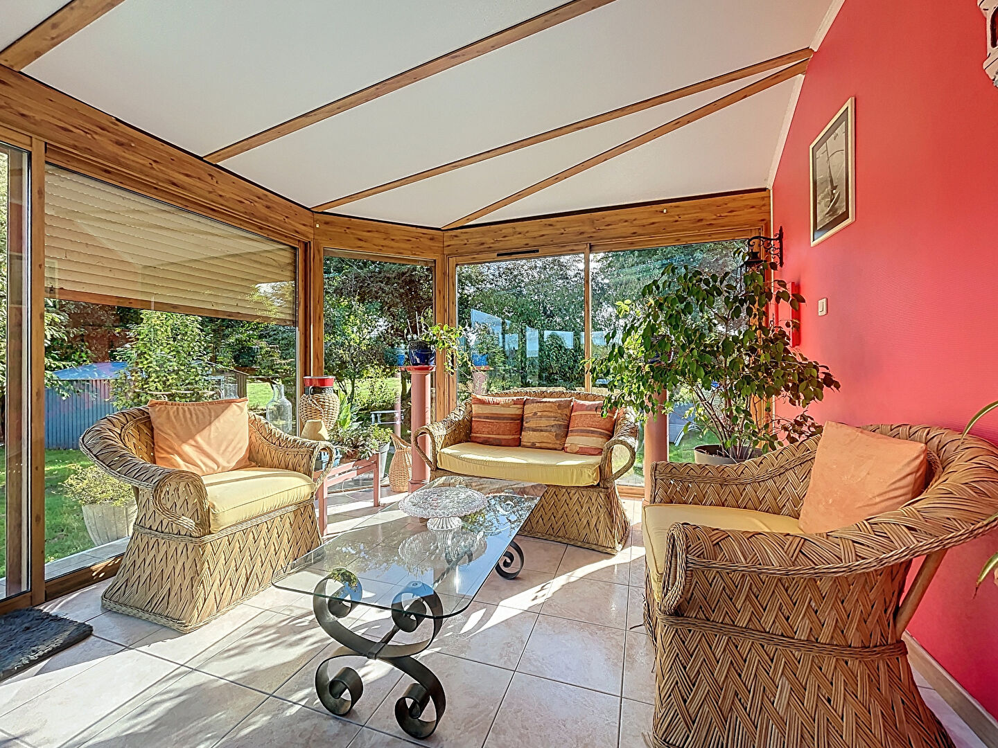 Au rez-de-chaussée, vous profiterez d'un grand salon/séjour avec insert, d'une véranda lumineuse, d'une cuisine ouverte aménagée et équipée, ainsi que de deux chambres, d'une salle d'eau et de WC séparés.