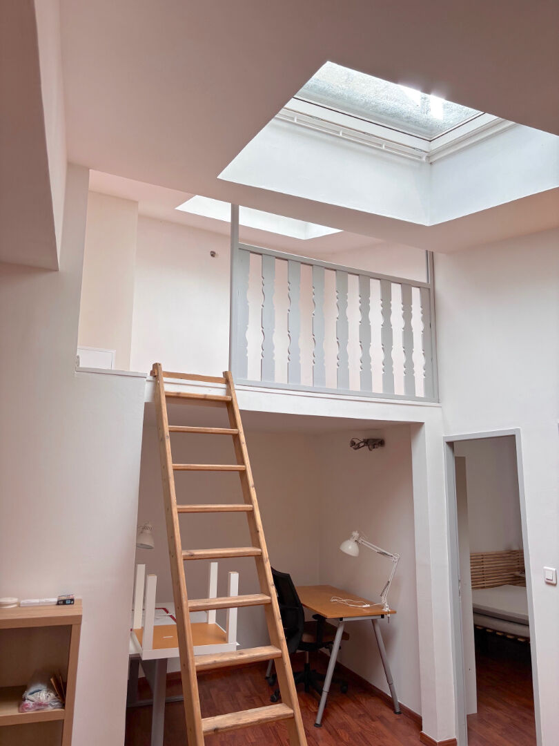 L'appartement se compose d'un séjour lumineux avec cuisine ouverte équipée, deux chambres avec rangements, une mezzanine modulable (bureau, rangement ou coin nuit), une salle de bain et des WC séparés.
