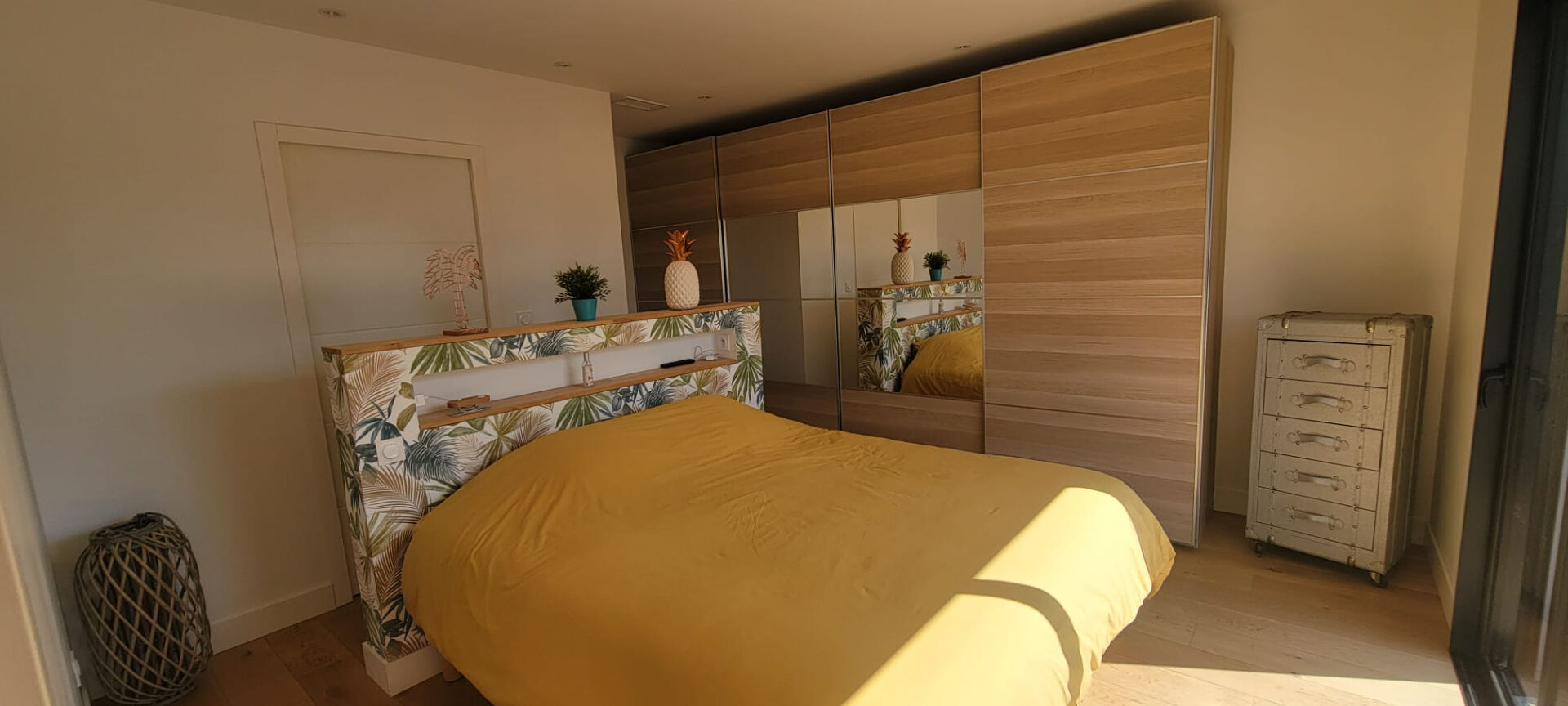 La partie jour se compose d'une entrée avec placard, d'un salon-séjour très lumineux avec sa baie à galandage et sa double exposition d'environ 50 M² avec climatisation gainable, d'une cuisine ouverte entièrement aménagée et équipée avec cellier et d'un WC indépendant.
