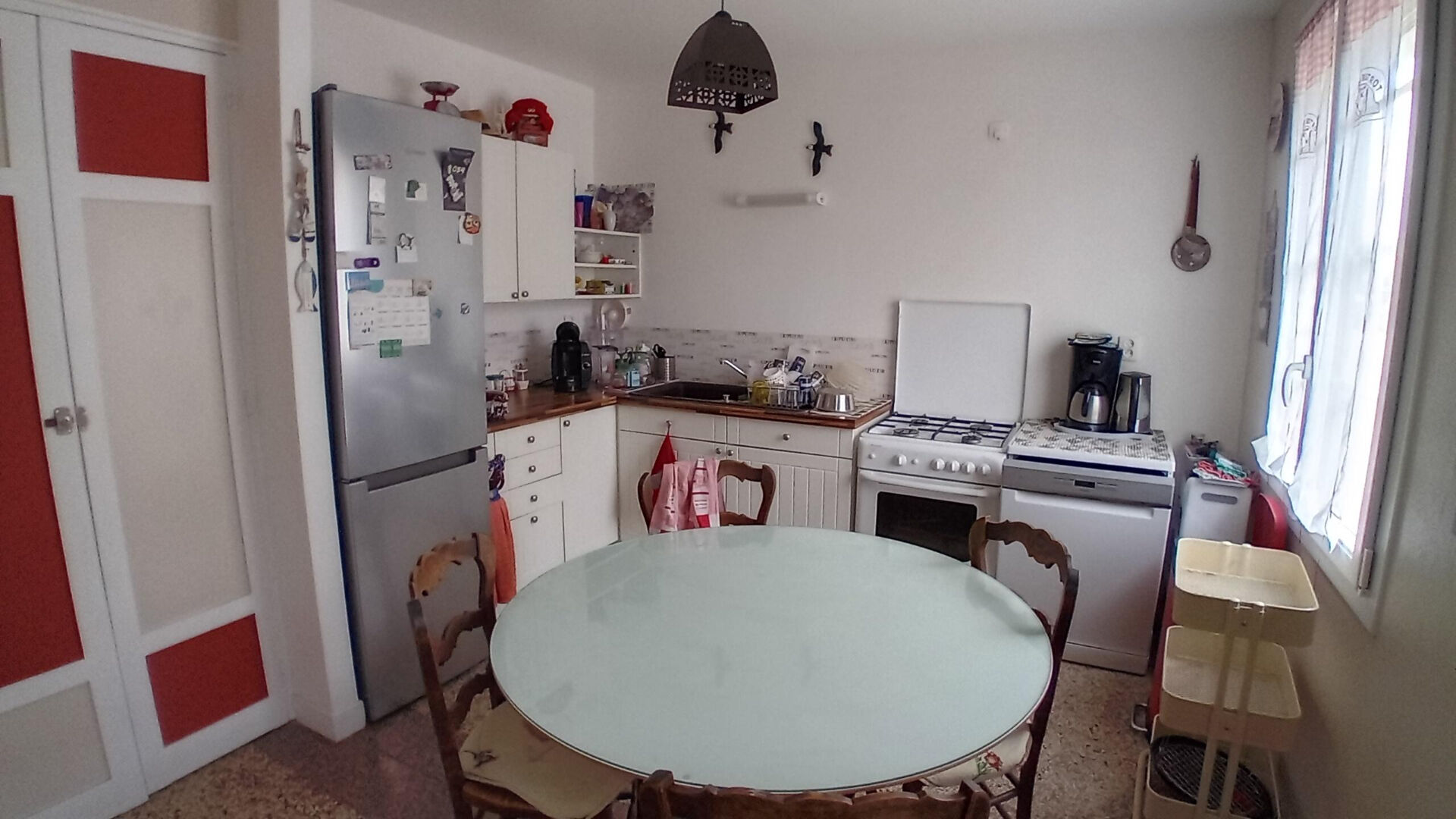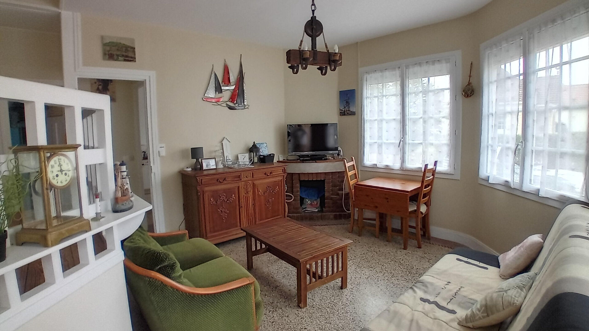 séjour lumineux avec cheminée, cuisine indépendante, deux chambres, salle de bains, WC, combles aménagés.