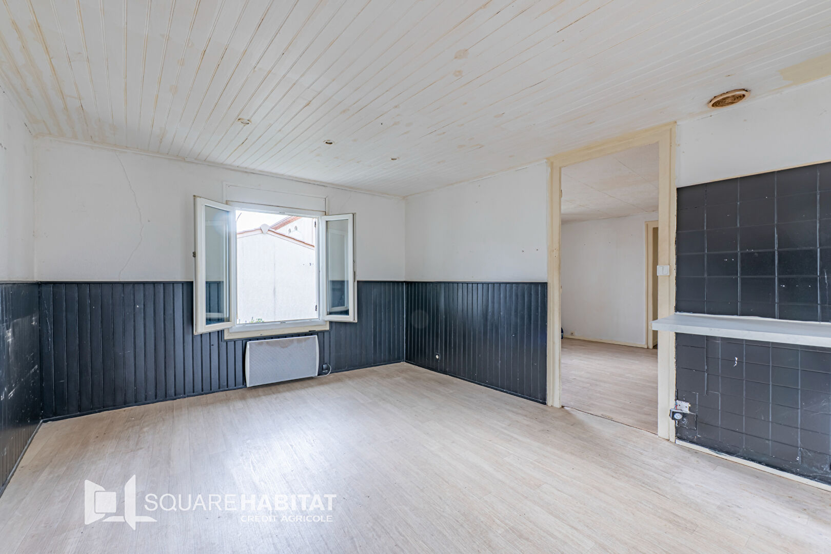 Au 1 er étage, vous entrez dans l'espace cuisine de 16 m2 traversante, un salon de 17 m2 et 2 chambres de 17.22 et 11.45 m2, Salle de bains avec baignoire, toilettes.