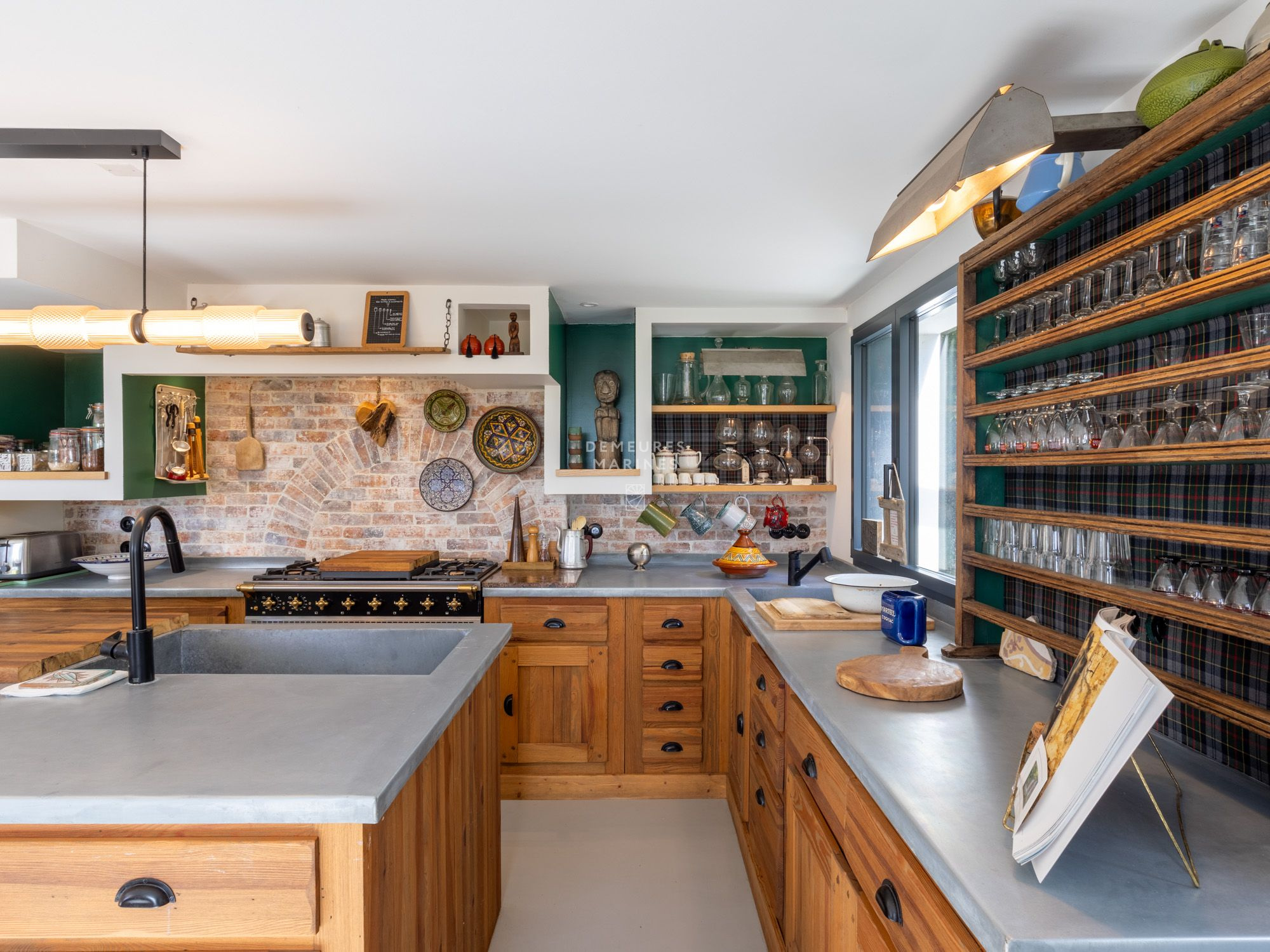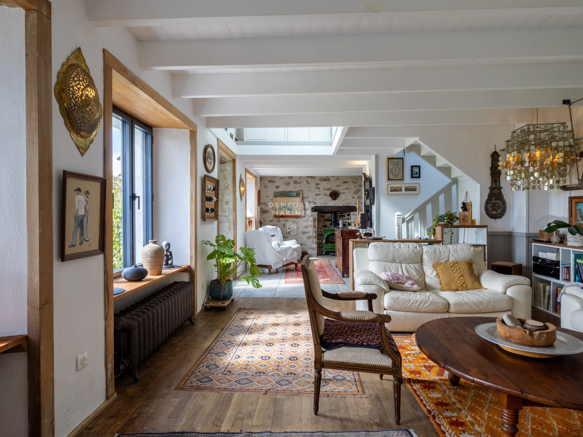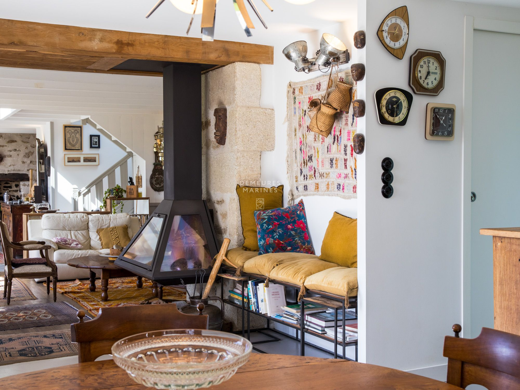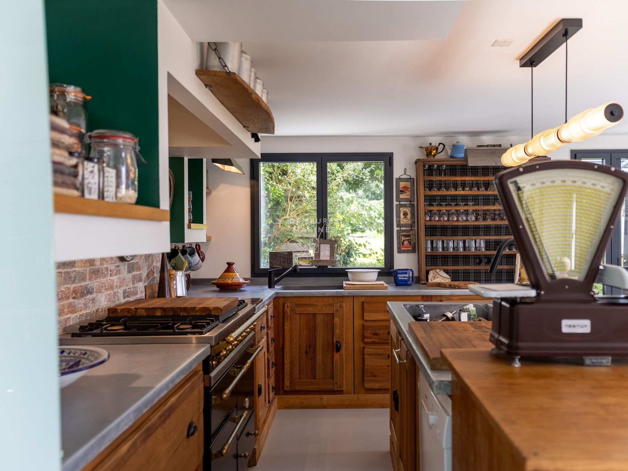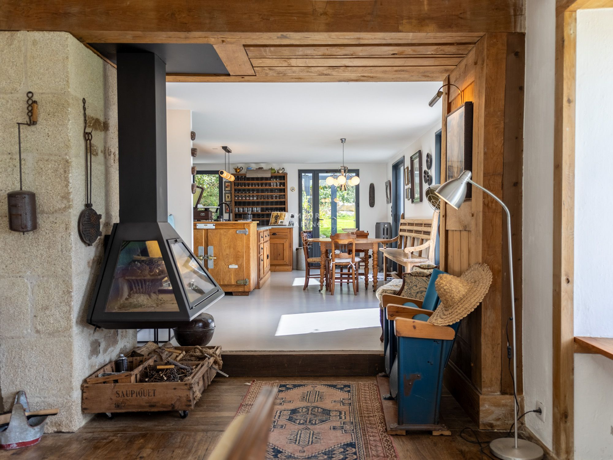 Entièrement rénovée, la maison mêle avec élégance l'ancien et le contemporain. Les espaces ont été ouverts pour offrir une belle pièce de vie : salon, séjour et cuisine se suivent dans une enfilade chaleureuse, rythmée par un poêle à bois, une cheminée et un îlot central façon billot. Les matières racontent une histoire : les parquets anciens s'unissent aux bétons cirés de la cuisine et des salles d'eau, dans une sobriété raffinée.