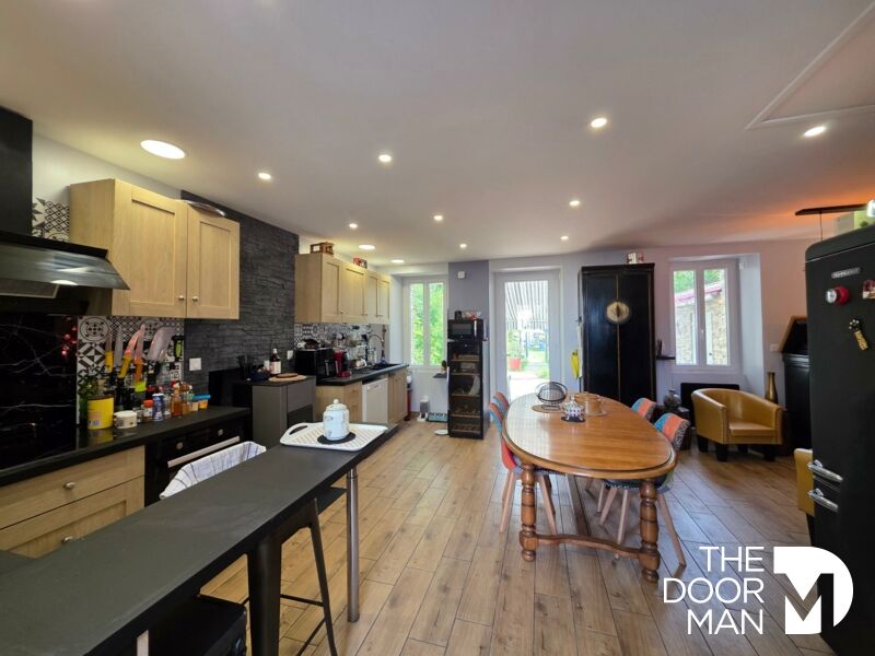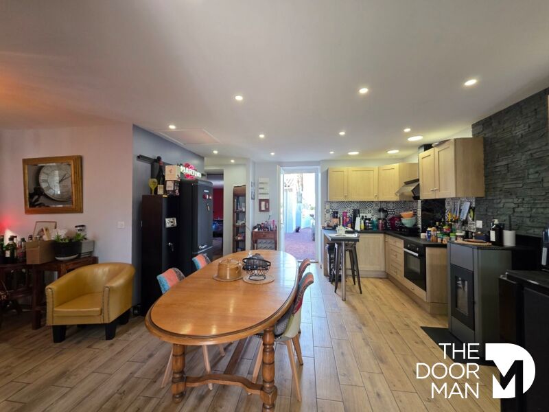 Une pièce de vie comprenant un coin salon et une cuisine aménagée et équipée (four, plaque induction et hotte) avec un poêle à pellets qui chauffe toute la maison.