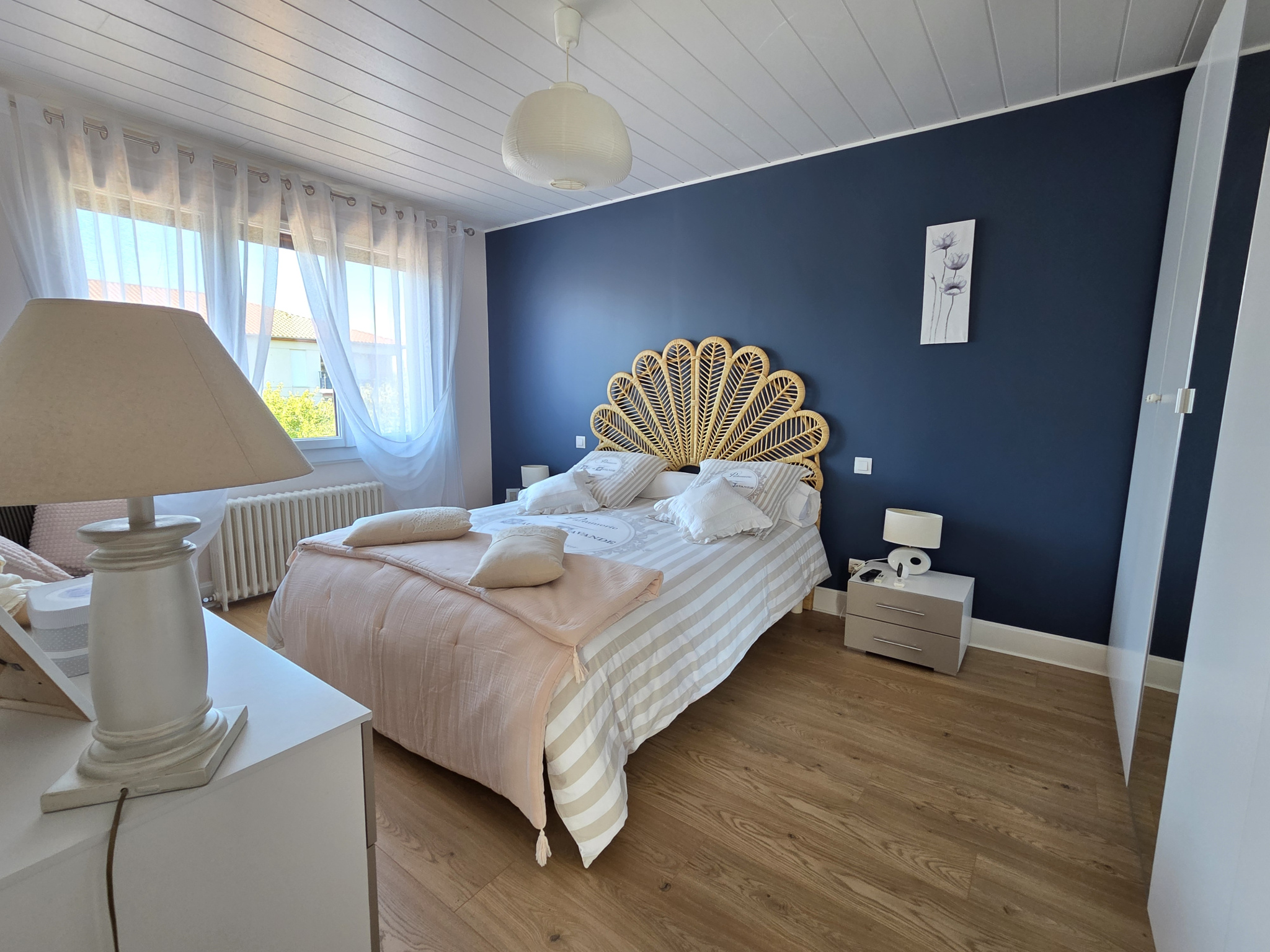 A l'étage : palier en mezzanine desservant deux grandes chambres (15 et 16,50m2) dont une avec placard-dressing, l'autre avec balcon, un bureau, une salle d'eau avec WC.