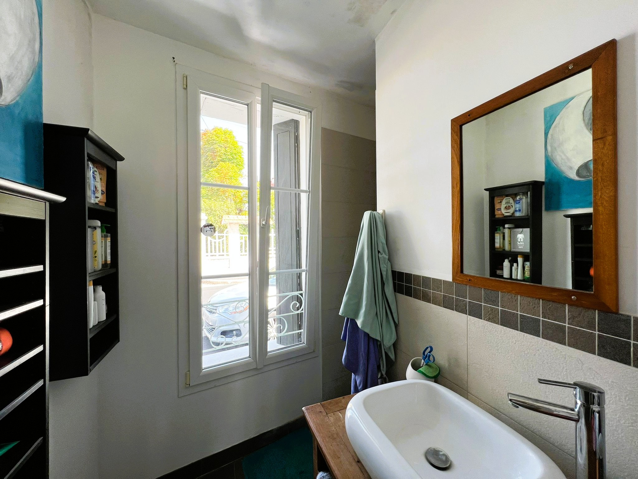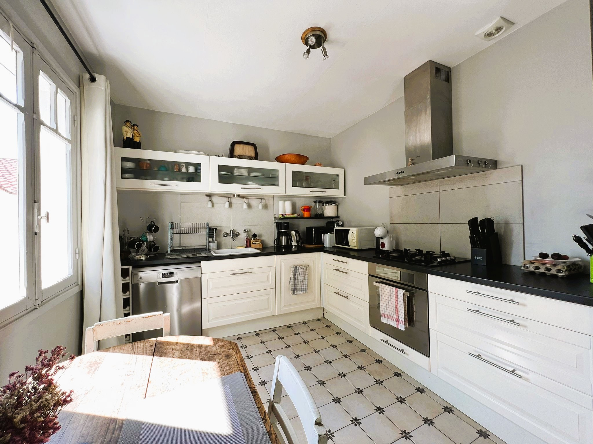 - au rez-de-chaussée : hall d'entrée avec placard, séjour, cuisine équipée (plaques gaz, hotte, four, lave-vaisselle, frigo) ouvrant sur cour exposée SUD, dégagement, WC, salle d'eau (douche à l'italienne), chambre.