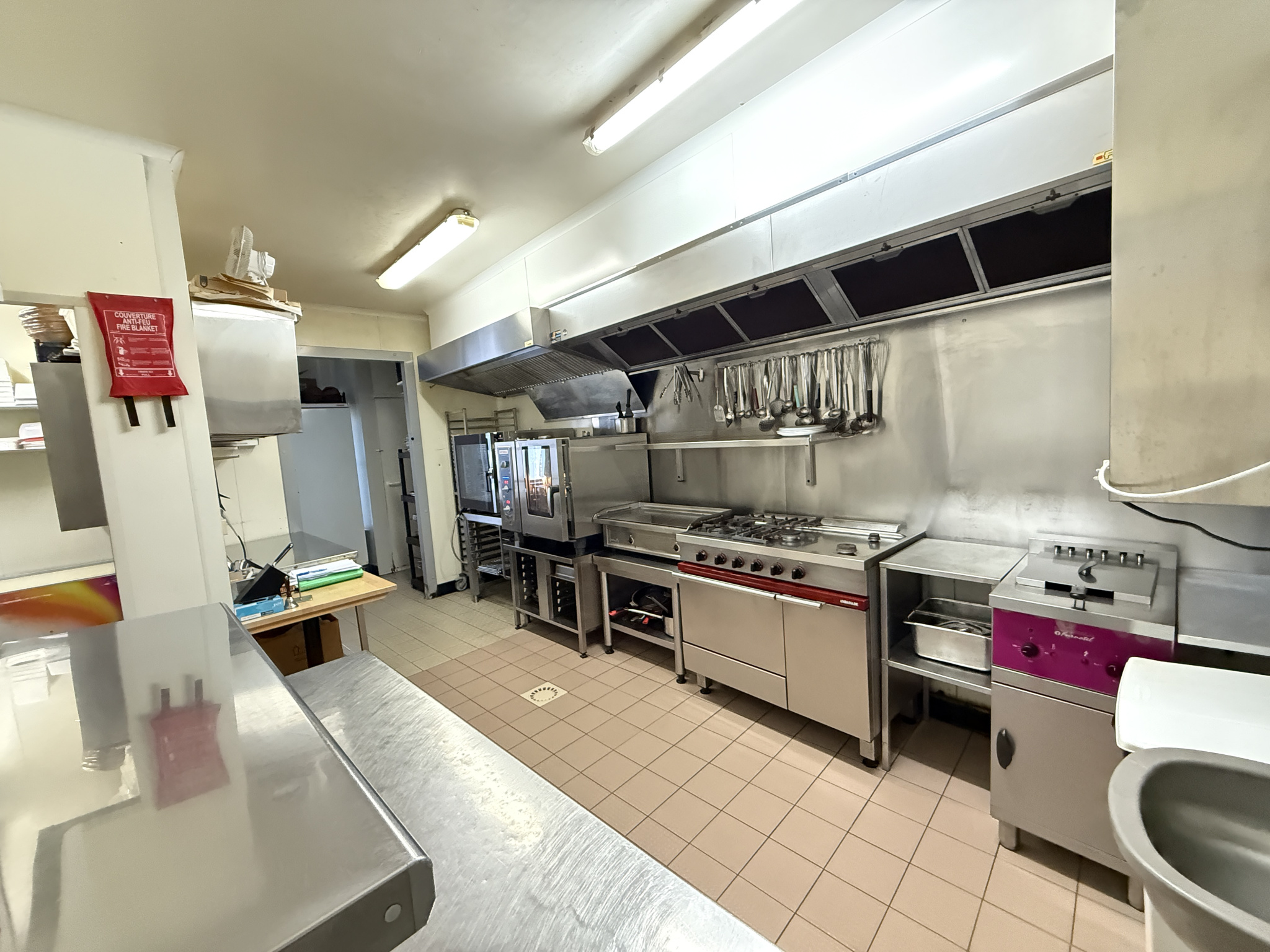 Un local commercial exploité en restaurant, avec deux salles de réception, un bar, bloc sanitaire, bureau, cuisine et réserve.