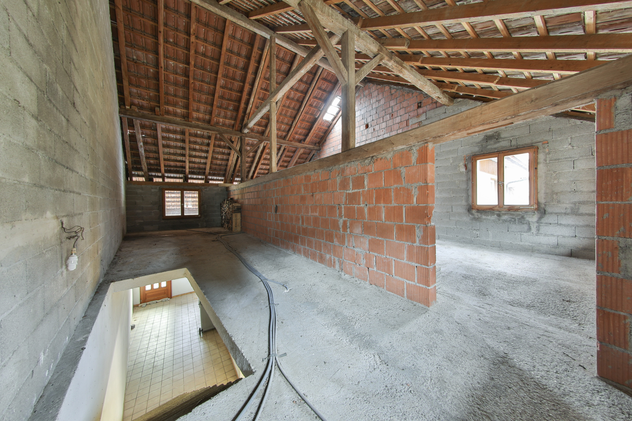 Au rez-de-chaussée de la maison, vous trouverez une entrée, une cuisine, un salon/salle à manger, une salle de bains équipée d'une baignoire et d'une douche, ainsi qu'un WC séparé. L'étage se compose de 4 chambres et d'un grenier aménageable offrant un beau potentiel.