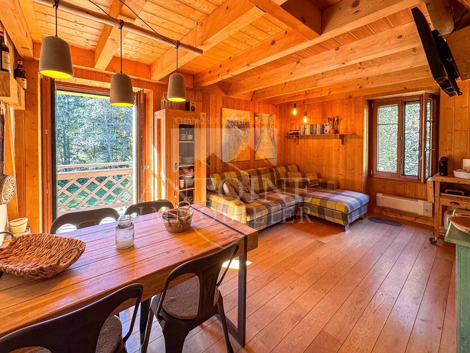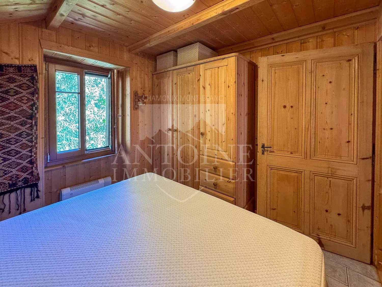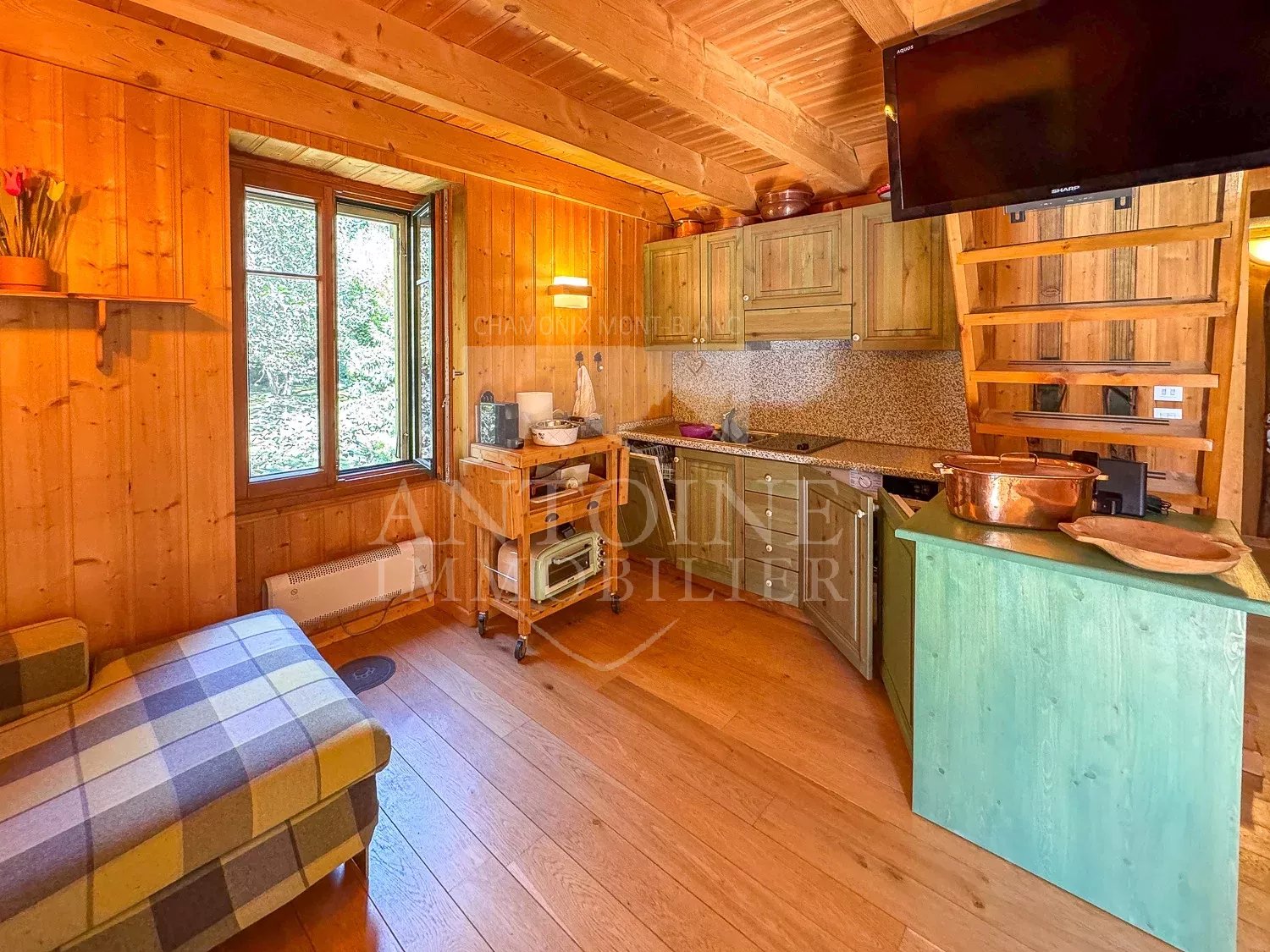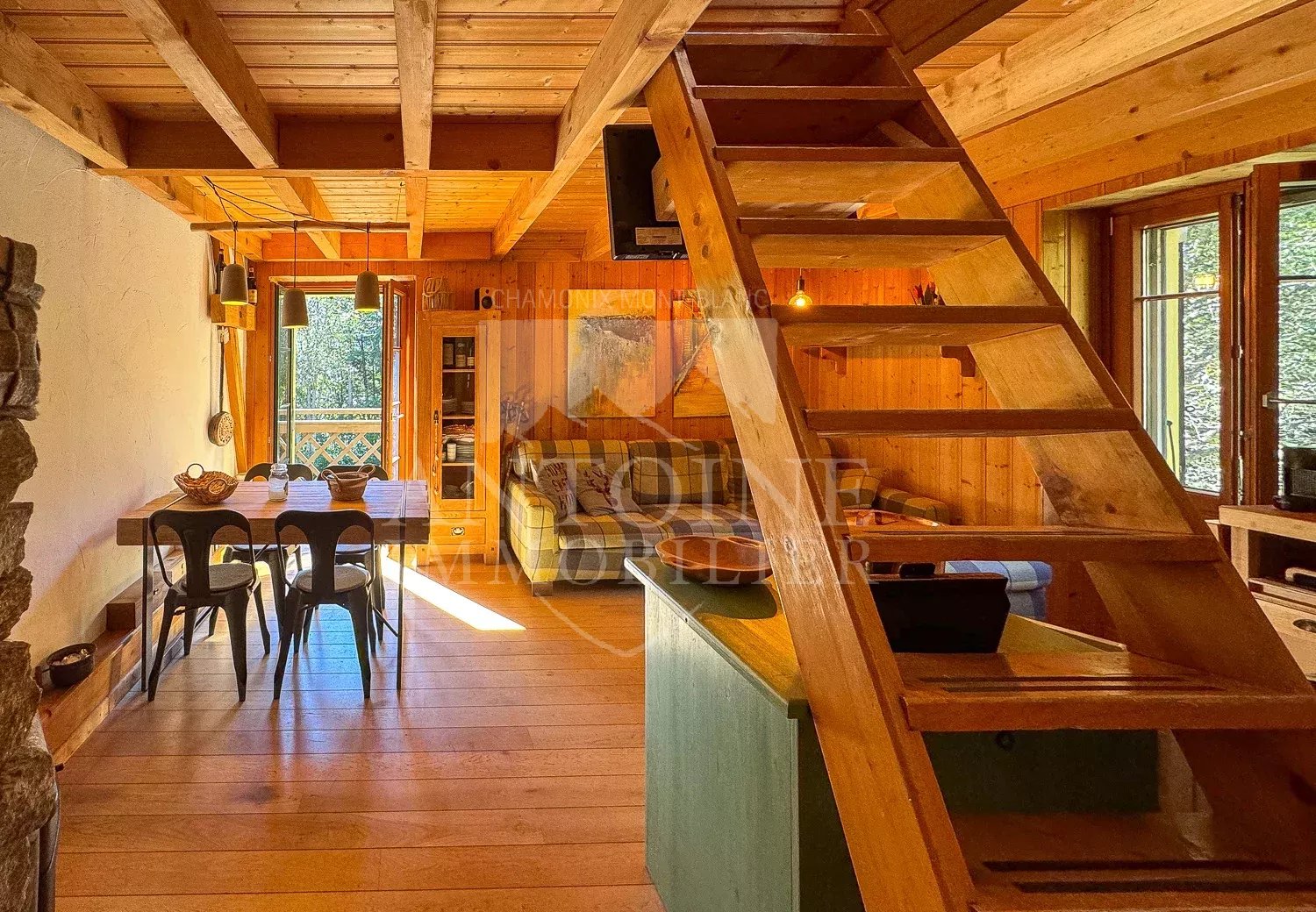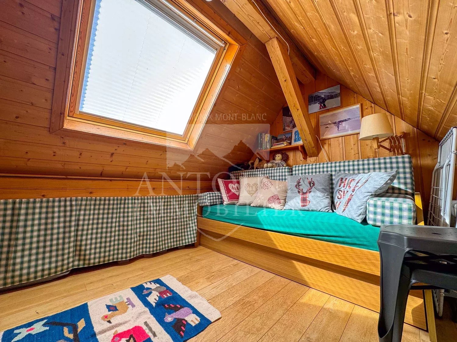 L'appartement se compose d'une entrée, un séjour chaleureux avec cuisine d'angle ouvrant sur un petit balcon orienté plein sud et face au Mont Blanc. Une chambre et une salle de douche avec WC complète ce niveau. Deux escaliers différents permettent d'accéder aux deux niveaux sous combles distincts l'un de l'autre formant des espaces couchages.