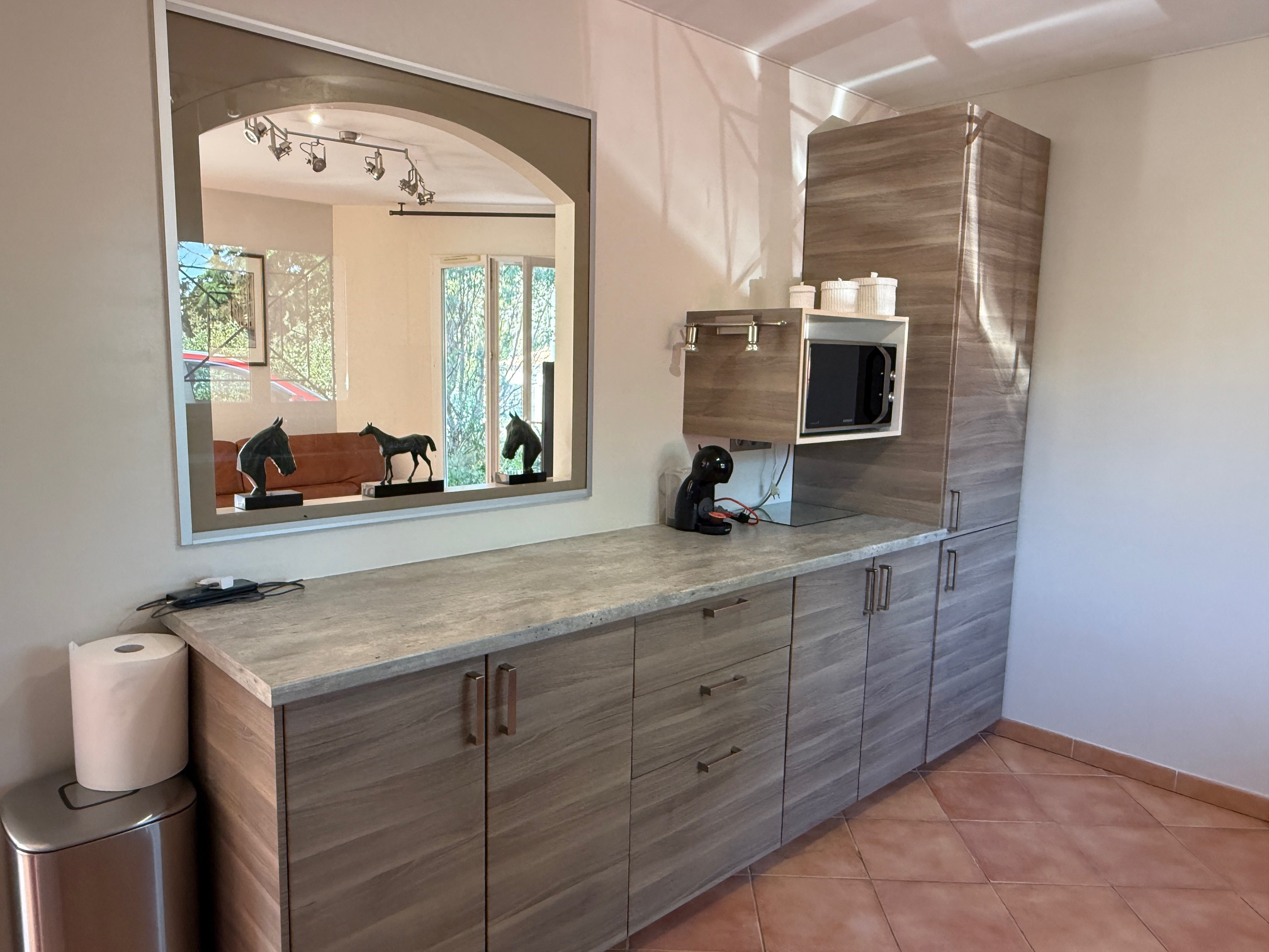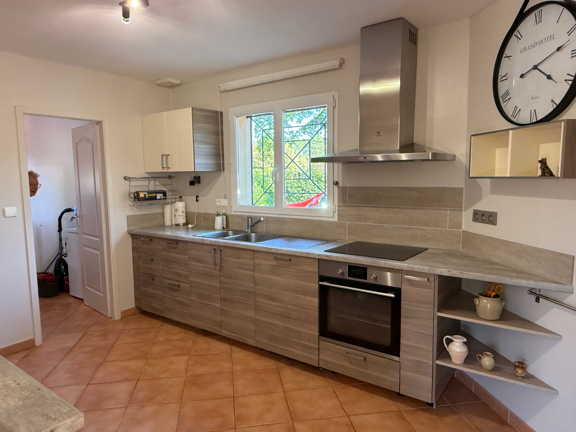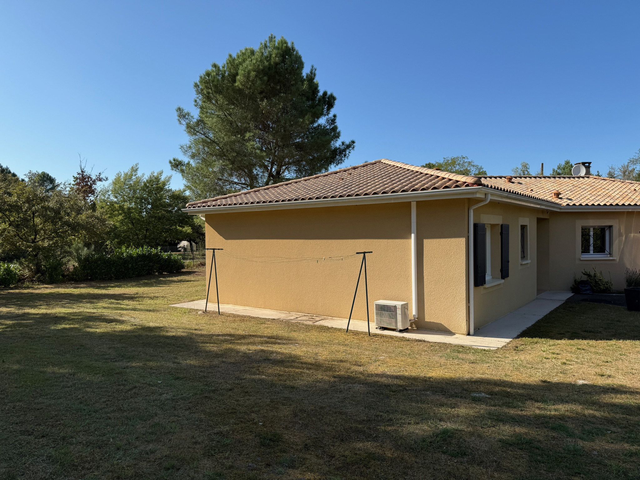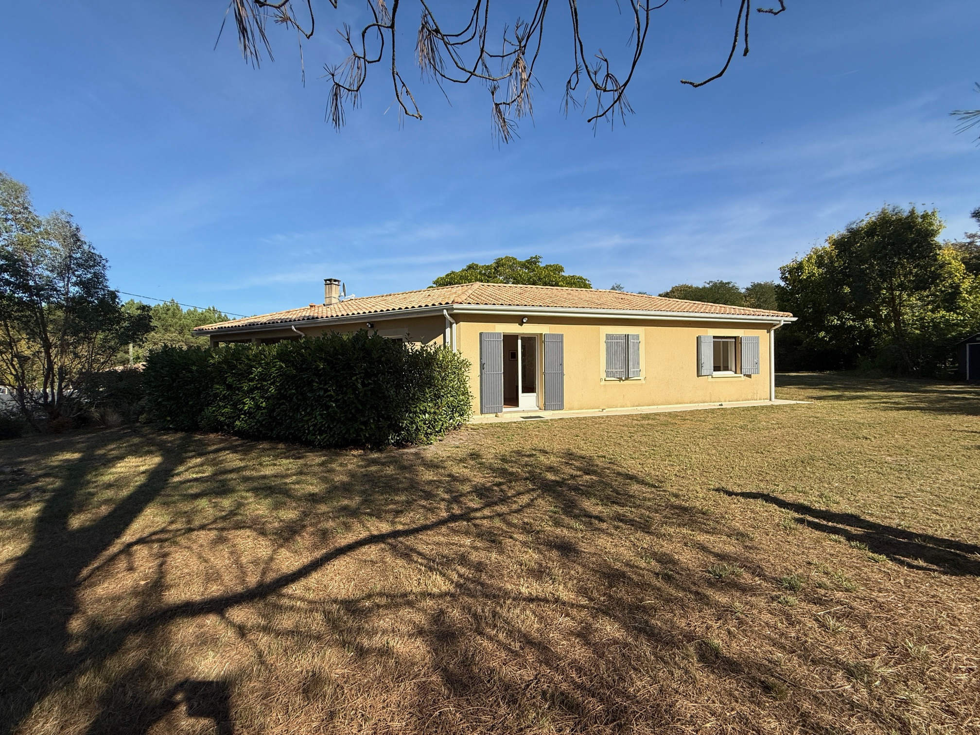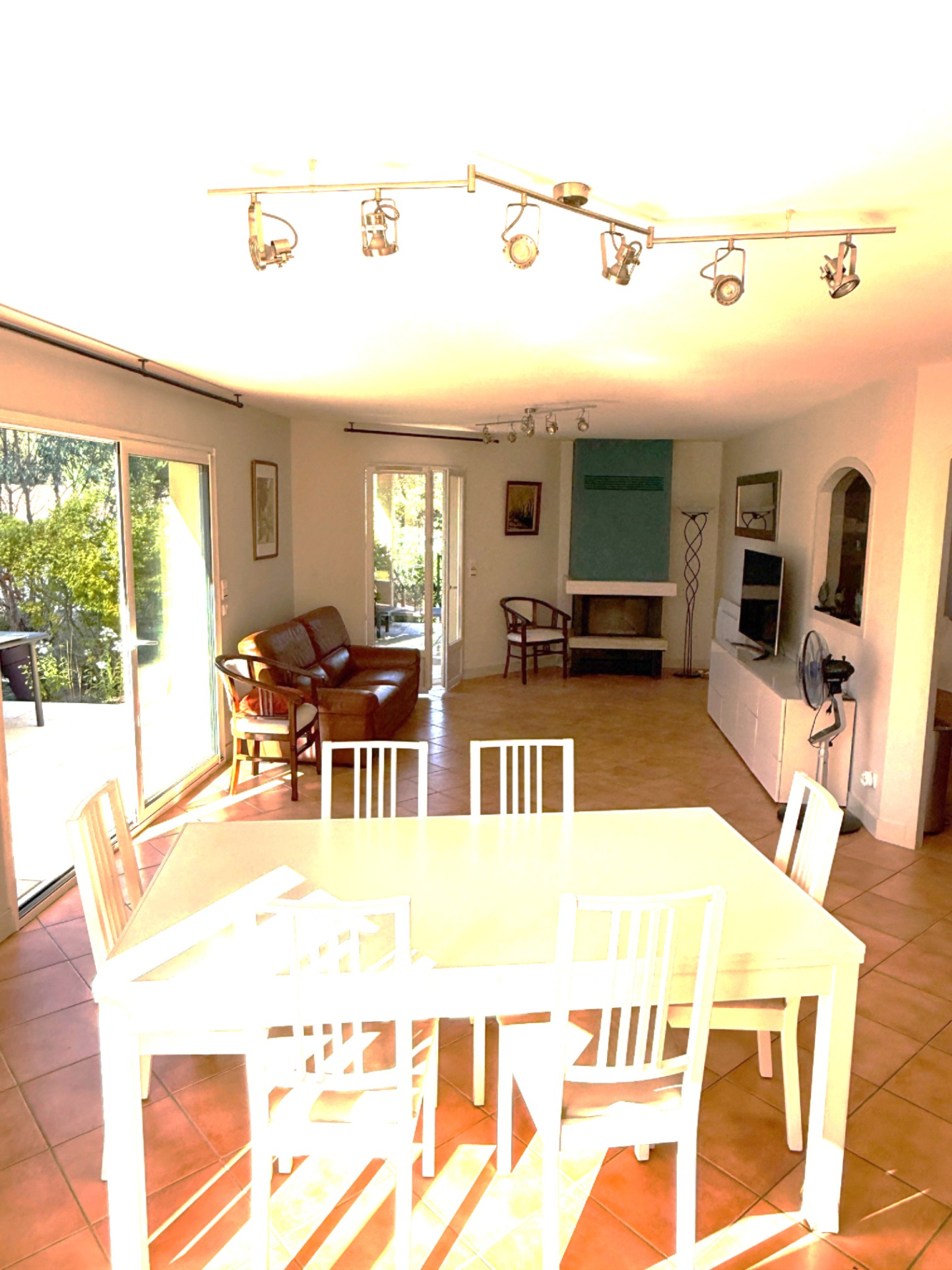 A découvrir sans tarder ! Dans un quartier calme et proche de toutes les commodités (cabinet médical, supermarché, commerces), maison 107m2 hab, de plain-pied sans aucun travaux à prévoir, Vous decouvrirez une entrée avec placard, un wc indépendant avec lave-mains, un séjour lumineux avec cheminée et climatisation, deux terrasses carrelées dont une couverte, une cuisine équipée avec son cellier attenant et communiquant avec le garage de 16m2. L'espace nuit avec son couloir climatisé comprend 3 belles chambres avec chacune son placard, une salle d'eau avec un deuxième wc. Tout en excellent état !