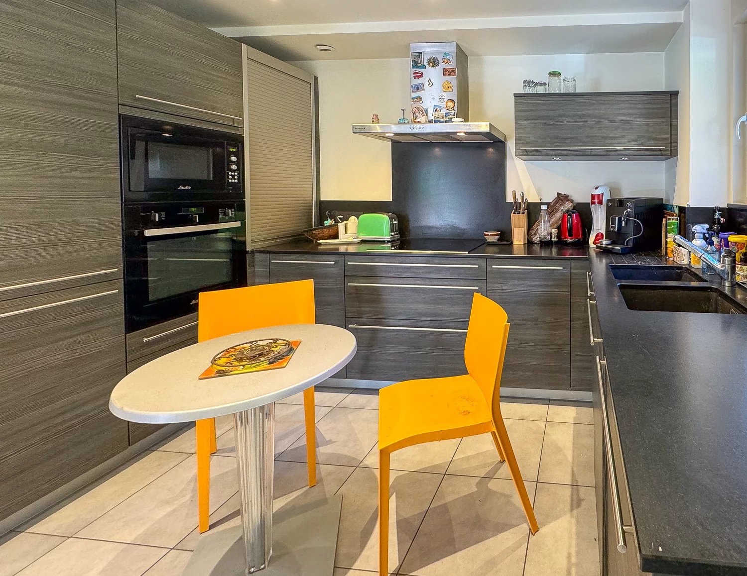 Description de l'intérieur : Dès l'entrée, la grande pièce de vie de 40 m2 comprend une cuisine ouverte et équipée, un séjour / salle à manger lumineux, doté d'un poêle à granulés RIGA récemment installé, offrant chaleur et ambiance cosy et un WC invités.