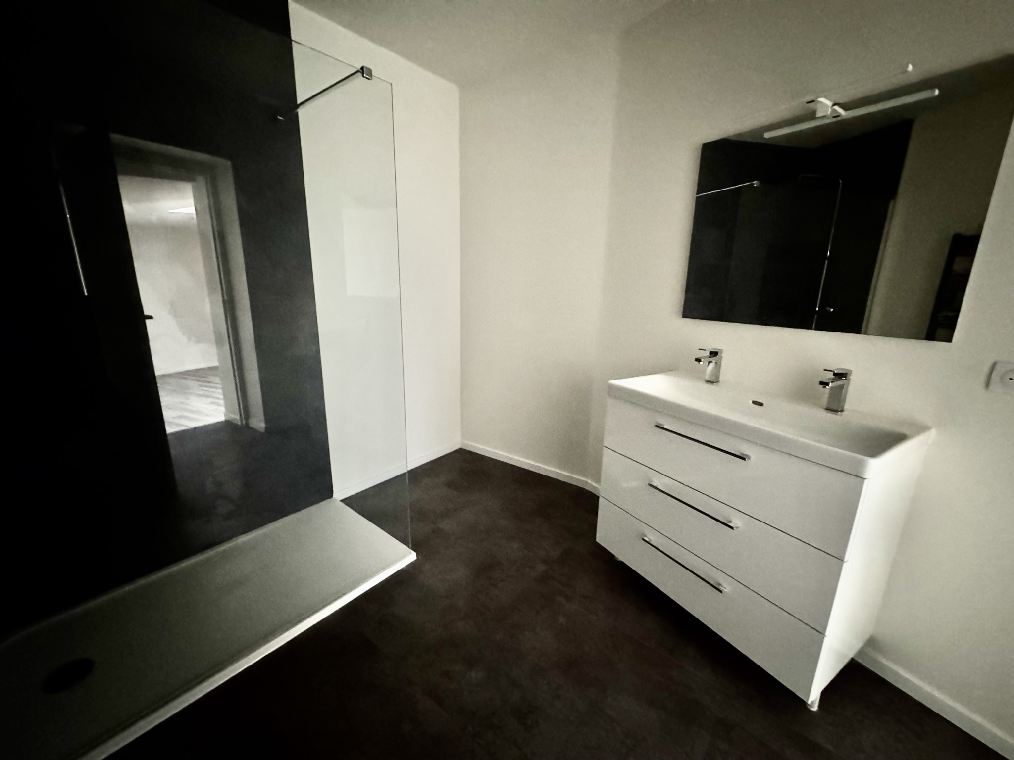 Il se compose d'une entrée, d'une chambre à coucher, d'un bureau avec accès à une cour intérieure, d'un salon séjour avec une cuisine aménagée et équipée (rangements, four, table de cuisson, hotte, branchement lave-linge et lave-vaisselle), et d'une belle salle d'eau avec une douche à l'italienne, un WC et une double vasque.