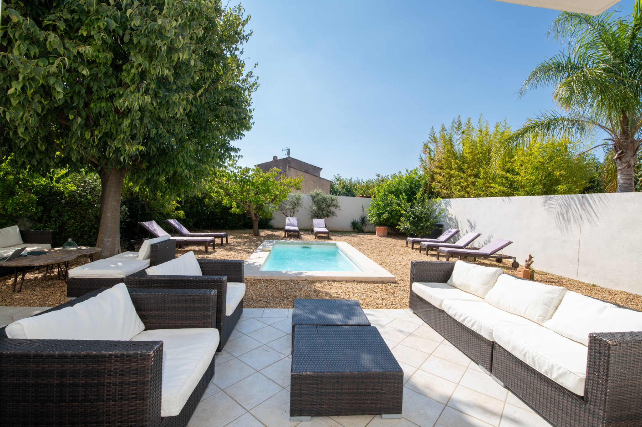 Nichée au fond d'une impasse, au calme, à seulement 1 km de la mer, cette villa entièrement climatisée de 163m2 séduit par son confort et ses volumes. Dès l'entrée, un vaste hall avec une cage d'escalier élégante, mise en valeur par une main courante en fer forgé et des sols en marbre, confère un cachet unique à la villa. Le salon lumineux, aux beaux volumes, s'ouvre sur une terrasse conviviale; la cuisine, entièrement équipée, s'intègre parfaitement dans le prolongement de la salle-à-manger. Côté nuit, la maison dispose de 4 chambres, toutes avec salle d'eau, ainsi qu'un bureau pouvant servir de 5ème chambre. Le terrain clos et arboré de 738m2 accueille une piscine entourée d'espaces détente. Garage, cave et rangements ajoutent un confort appréciable. En excellent état général, cette villa peut accueillir ses futurs propriétaires aussi bien en résidence principale que secondaire. Elle peut par ailleurs être vendue meublée, permettant une installation immédiate.