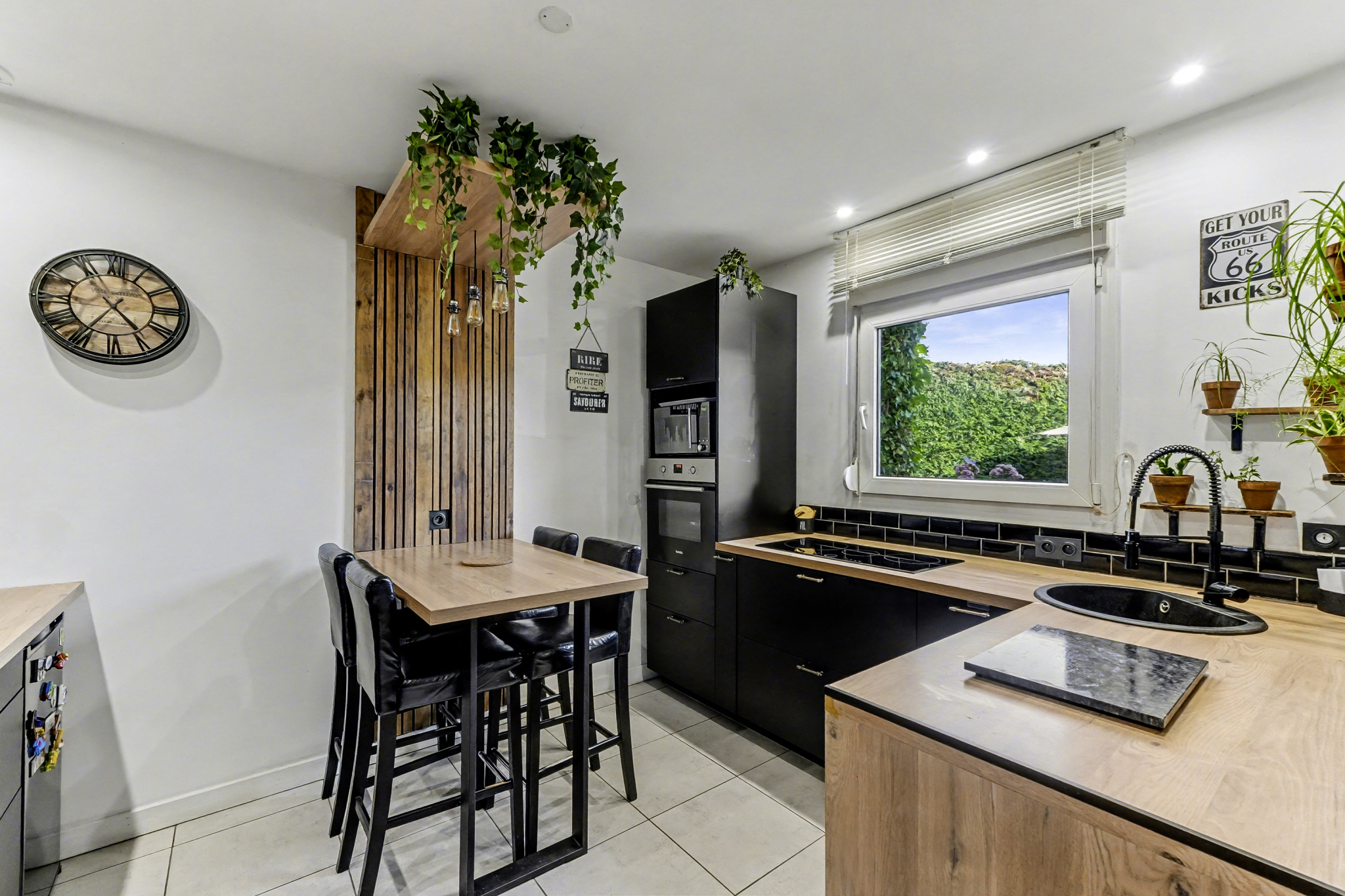 Dès l'entrée, la maison vous acceuille chaleureusement avec sa verrière atelier ouvrant sur une cuisine noire et bois, entièrement équipée, à l'esprit industriel , donnant ensuite sur une belle pièce de vie alliant une salle à manger prête à acceuillir de bons repas entre amis, et un salon cosy invitant à la détente.
