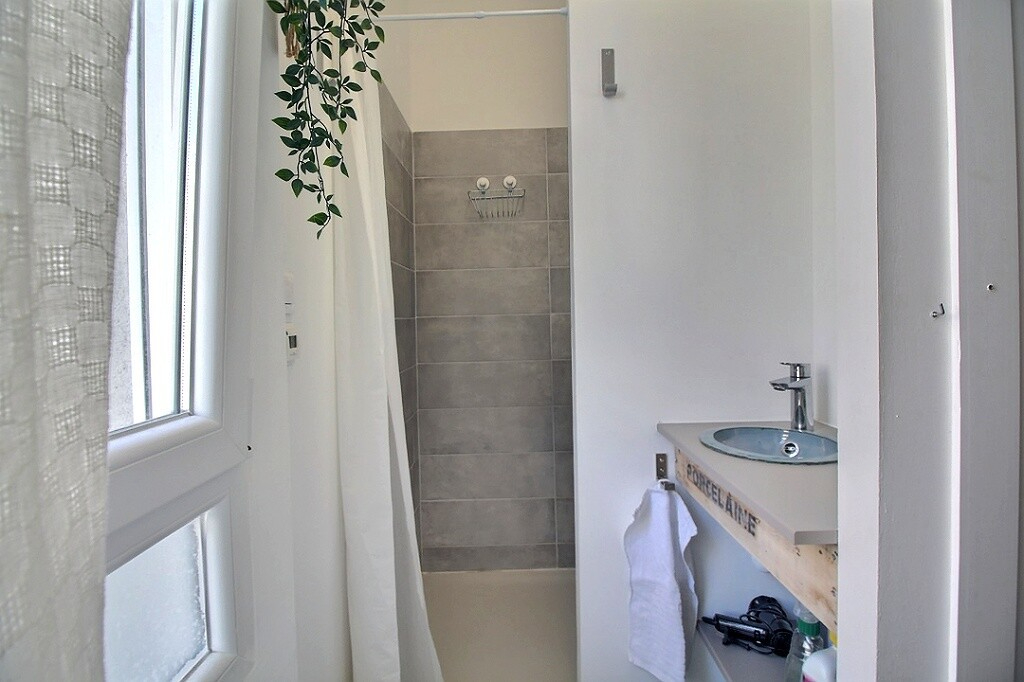 De plein pied, la maison est composée d'une pièce de vie avec cuisine américaine aménagée et équipée, de deux chambres dont une avec cheminée et sa propre salle de douche + wc, d'une seconde salle de douche avec wc.
