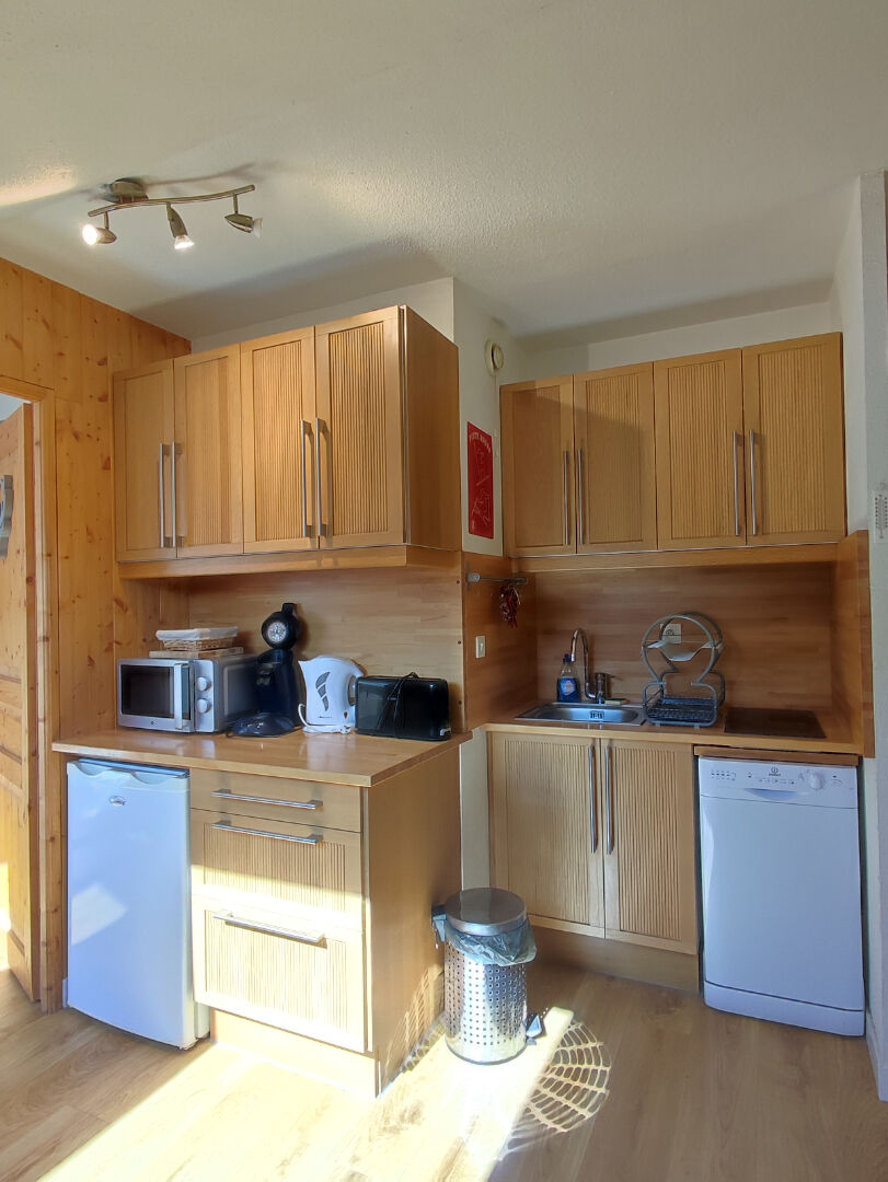PIEDS DE PISTES pour cet appartement rénové, doté d'une entrée, une salle d'eau avec WC, une pièce de vie avec cuisine équipée bien pensée, et une chambrette séparée.