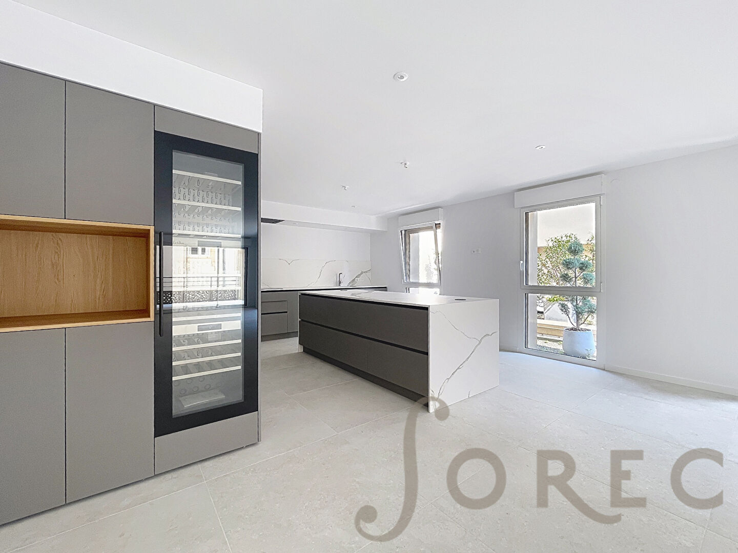 Une cuisine haut de gamme entièrement équipée, avec îlot central, cave à vin, cellier attenant et placard intégré avec porte dérobée.