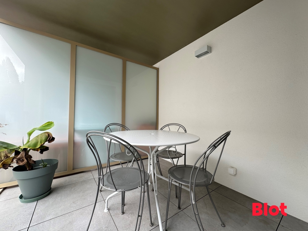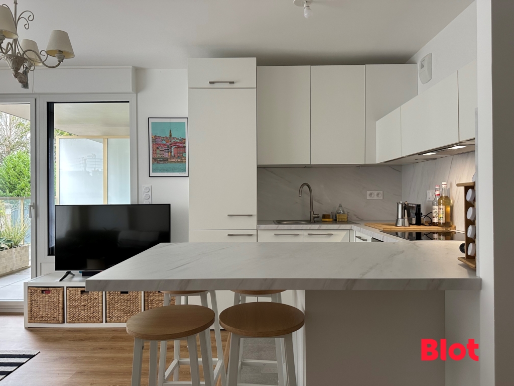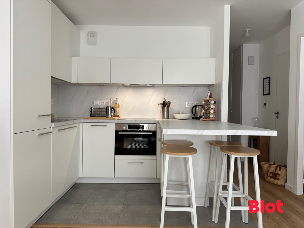 L'appartement se compose d'une entrée avec placard, d'une belle pièce de vie lumineuse, avec une cuisine entièrement aménagée et équipée, une belle terrasse dans le prolongement de cette pièce de vie double l'espace de vie lors de la belle saison.