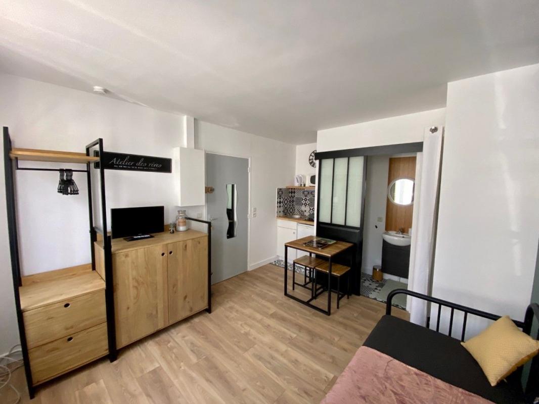 Il offre une belle pièce principale avec une cuisine ouverte aménagée et équipée, ainsi qu'une salle d'eau avec WC, fonctionnelle et moderne.