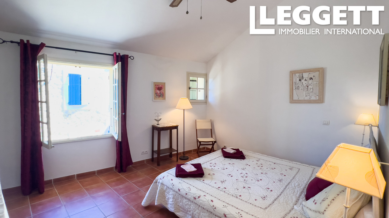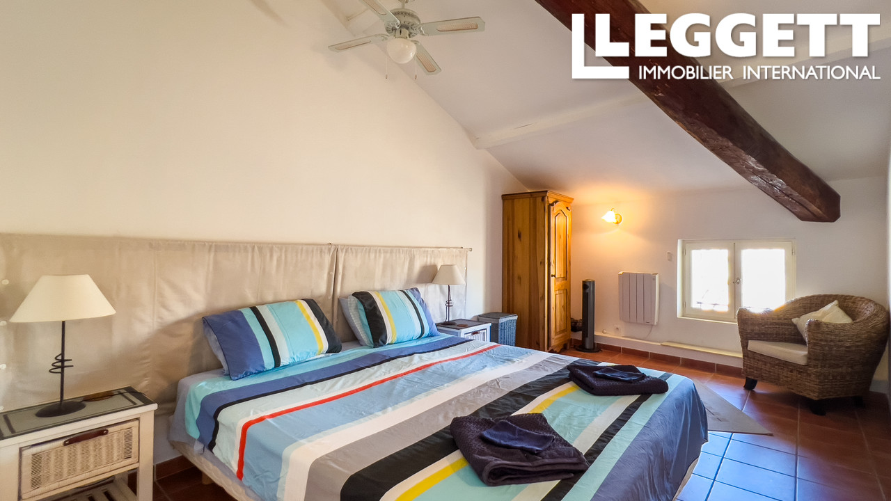 La propriété comprend une maison principale sur deux niveaux avec un salon lumineux, une cuisine spacieuse, des chambres dont une suite parentale, une terrasse devant l'entrée et une petite terrasse sur le toit offrant une vue sur le village.