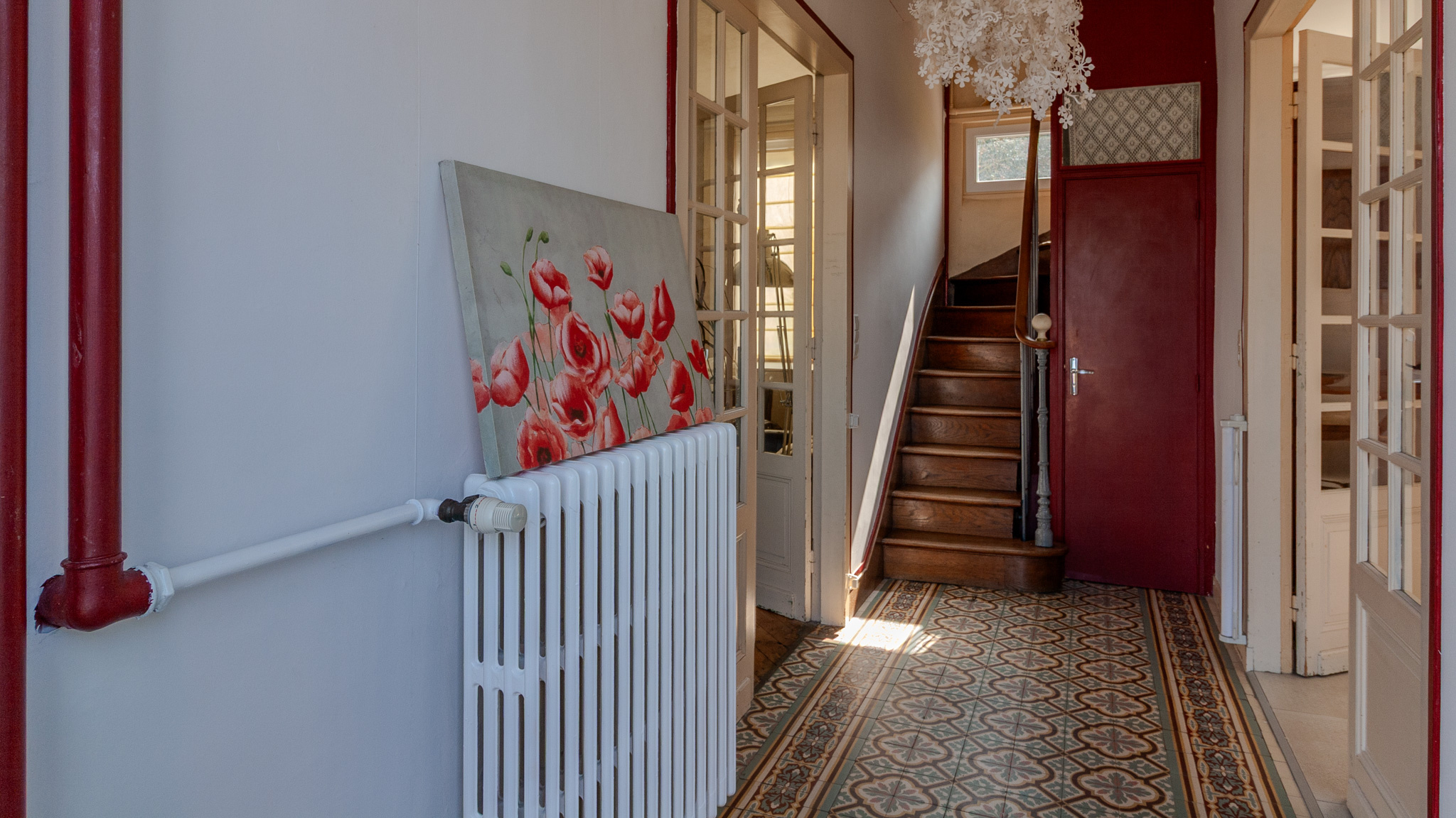 En ouvrant la porte, vous serez accueillis dans une entrée typique en carreaux de ciment desservant un salon châleureux avec cheminée et parquet ancien ainsi qu'une salle à manger traversante très lumineuse.