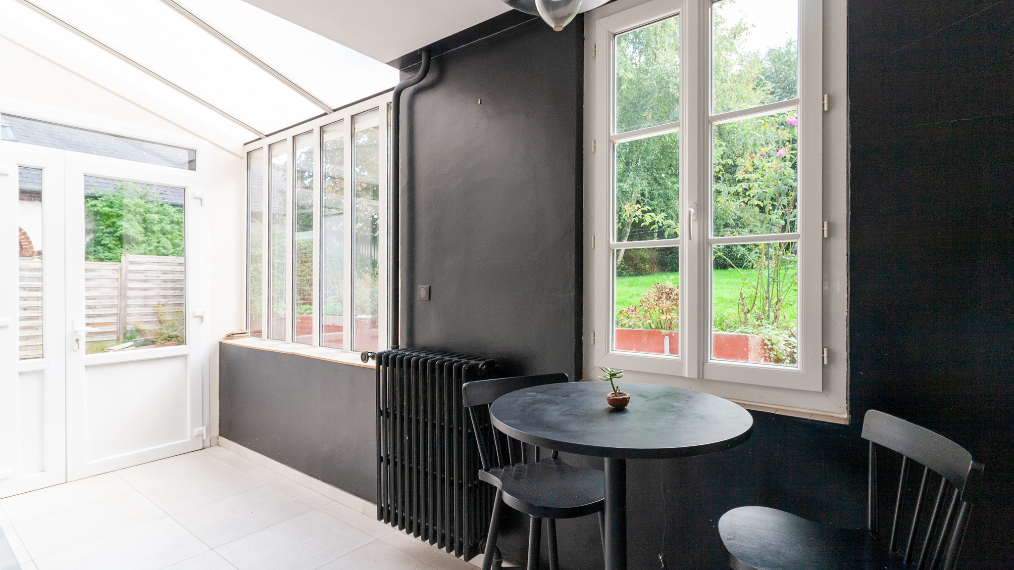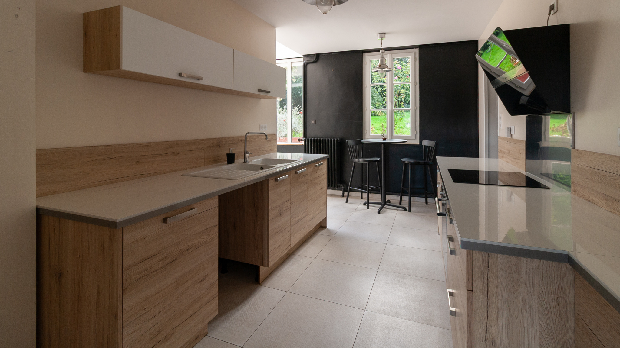 En passant la porte donnant sur une verrière, la cuisine totalement équipée vous bluffera par ses rangements et sa fonctionnalité.