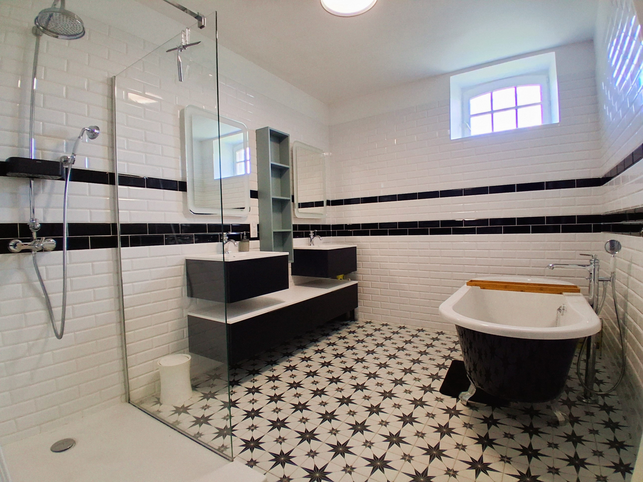 - En rez-de-chaussée : entrée, cuisine aménagée/équipée, vaste séjour/salon avec cheminée ouverte, tommettes et poutres apparentes anciennes, grande chambre avec dressing, salle de bains avec douche et baignoire, WC avec lave-mains, buanderie.