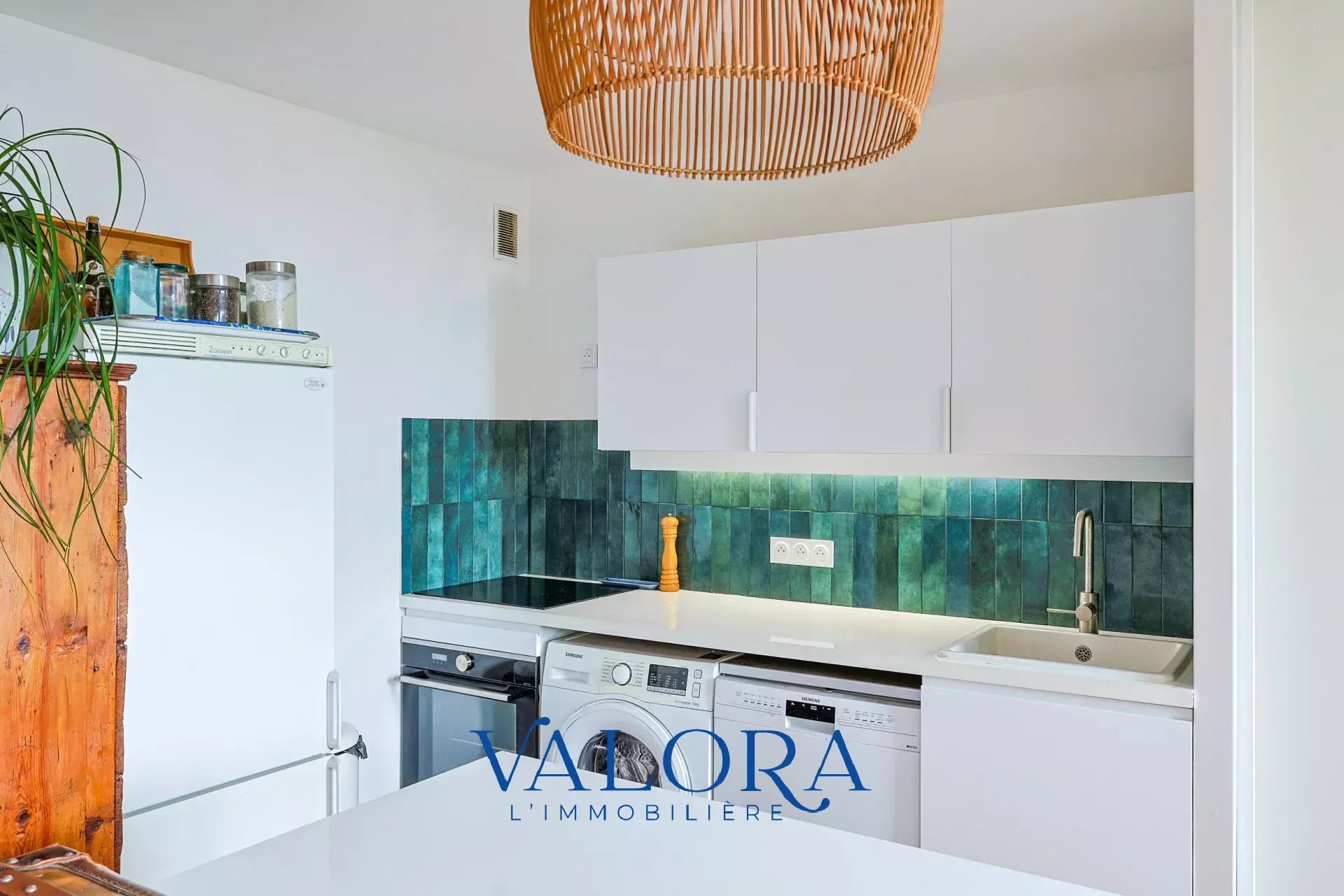 La cuisine équipée est ouverte sur la réception qui elle-même s’oriente vers la terrasse au sud, représentant un espace de vie supplémentaire ou l'on peut aisément dresser une table pour 6 personnes