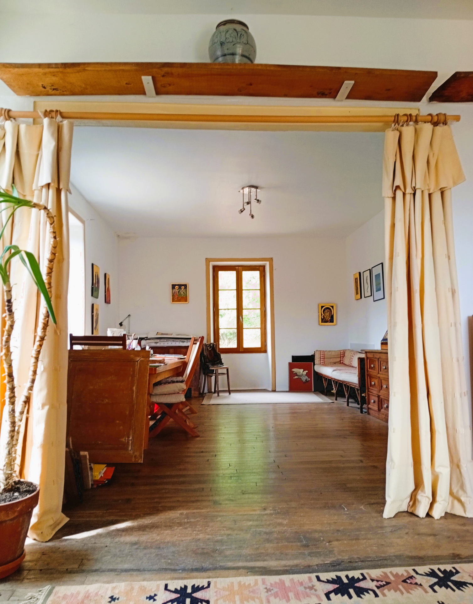 Aile droite : Grande pièce en L (env. 50 m2) avec cheminée Godin et accès à un balcon avec escalier en pierre menant au jardin actuellement utilisée comme atelier/studio mais idéale en appartement d'amis