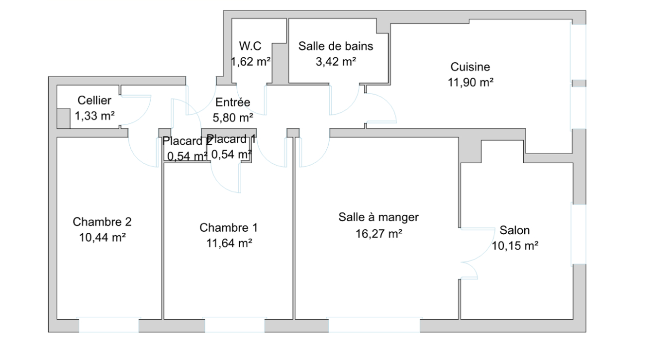 Il se compose d'une entrée donnant sur un couloir desservant deux chambres, un cellier, deux placards, un séjour ouvrant sur le salon (possibilité 3ème chambre), une cuisine indépendante et une salle d'eau.
