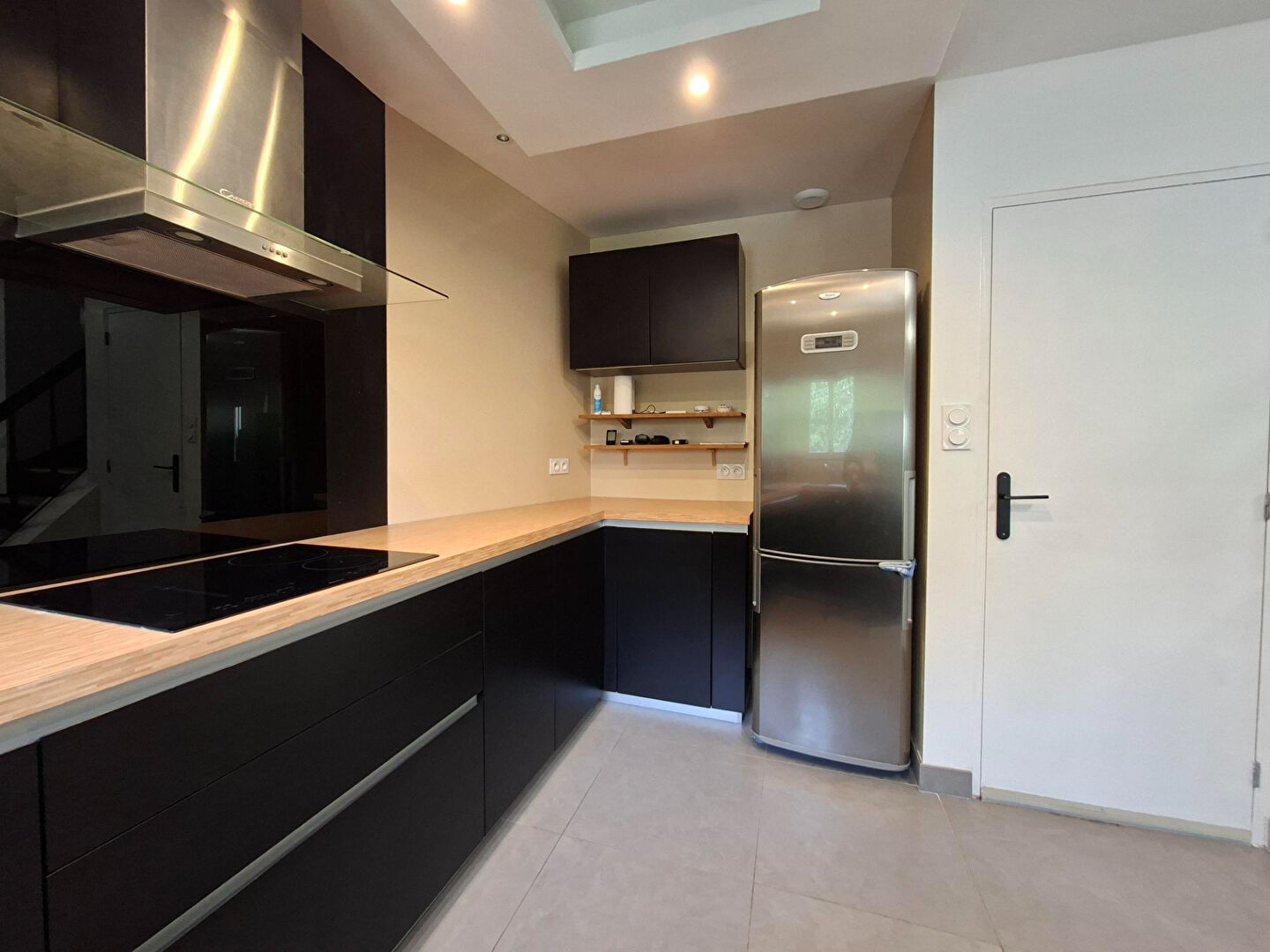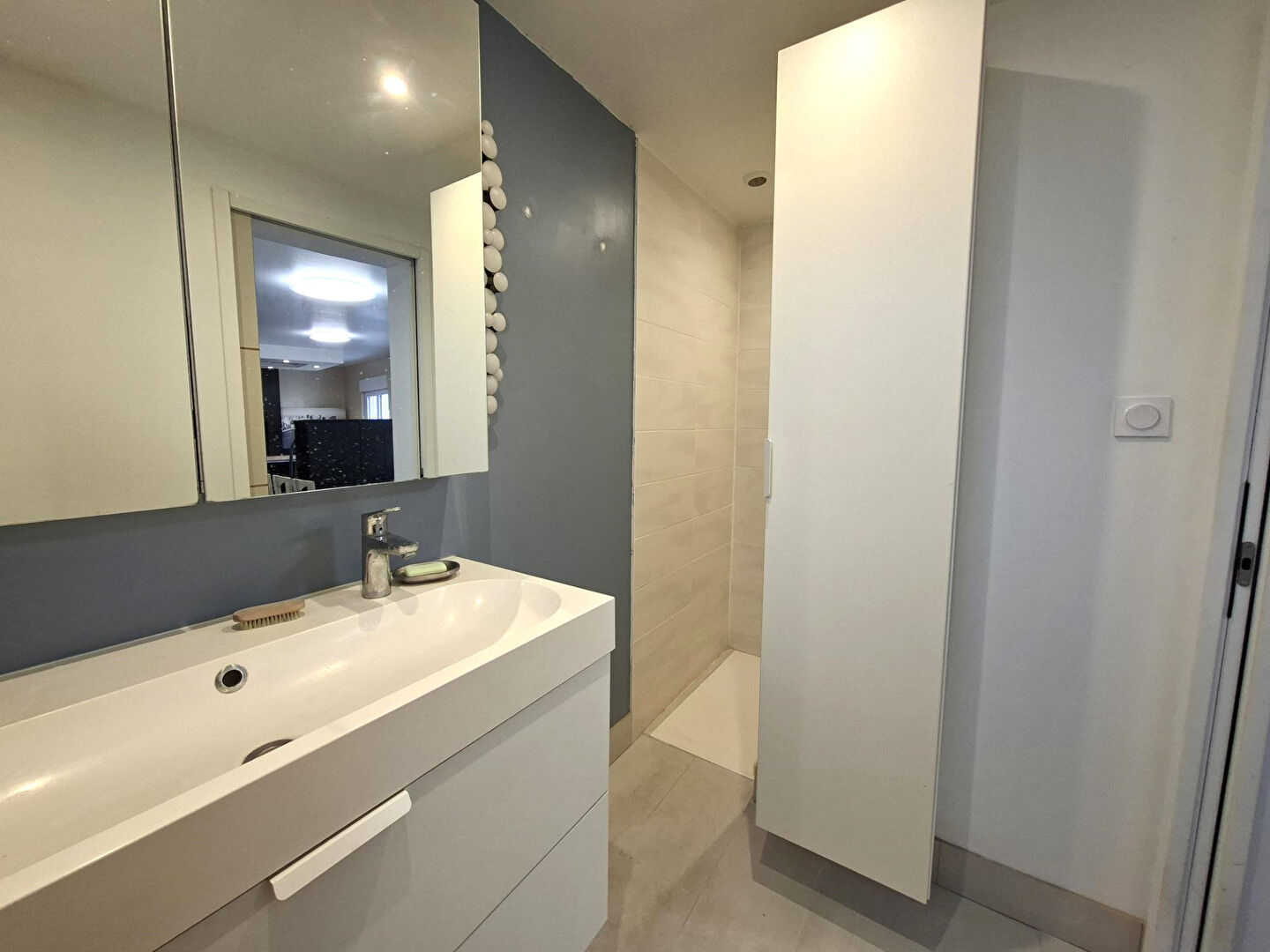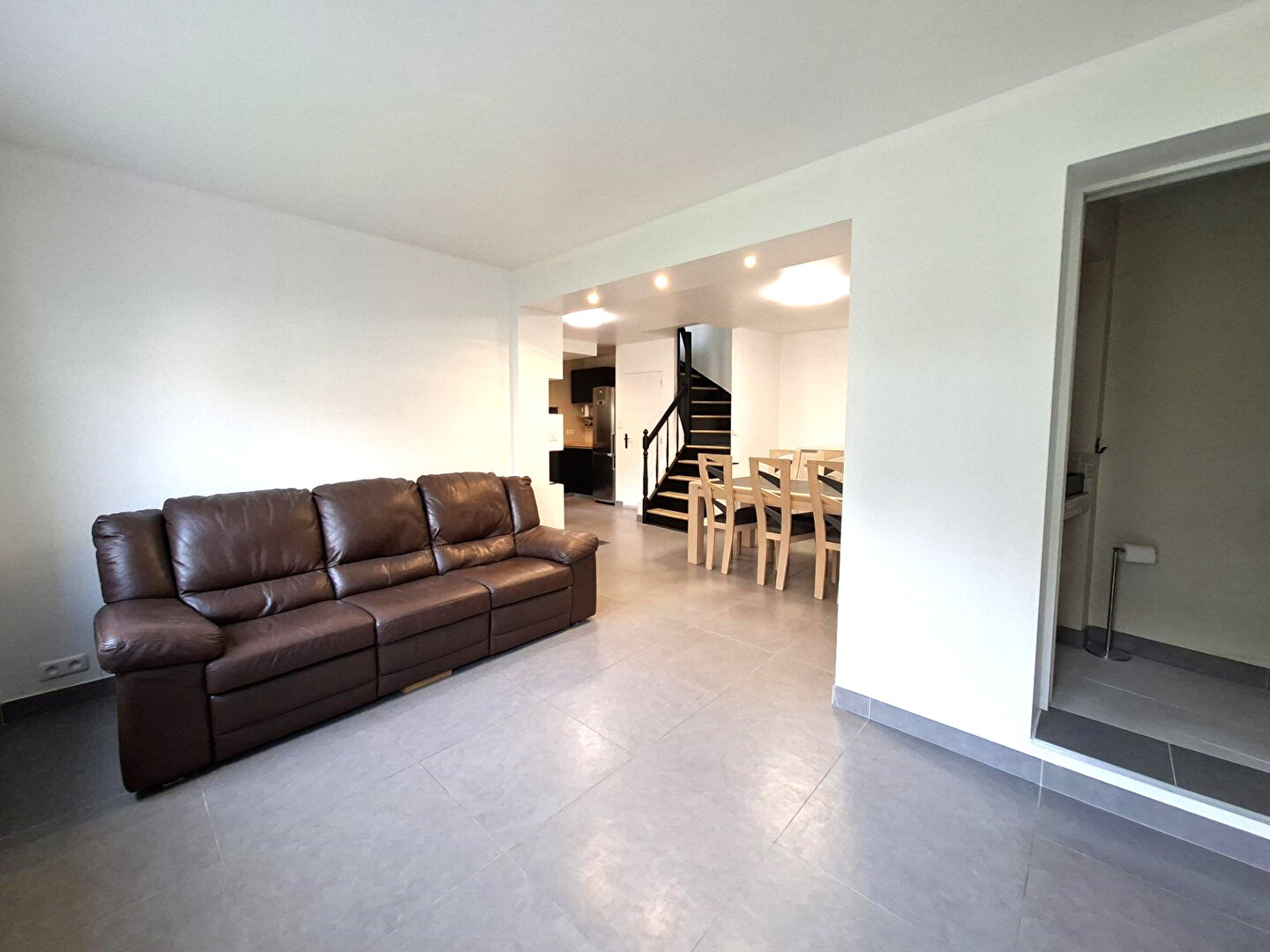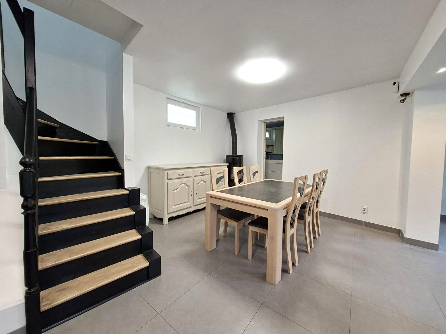 - Au rez-de-chaussée : entrée, cuisine aménagée et équipée ouverte sur le séjour, salle de douche, WC.