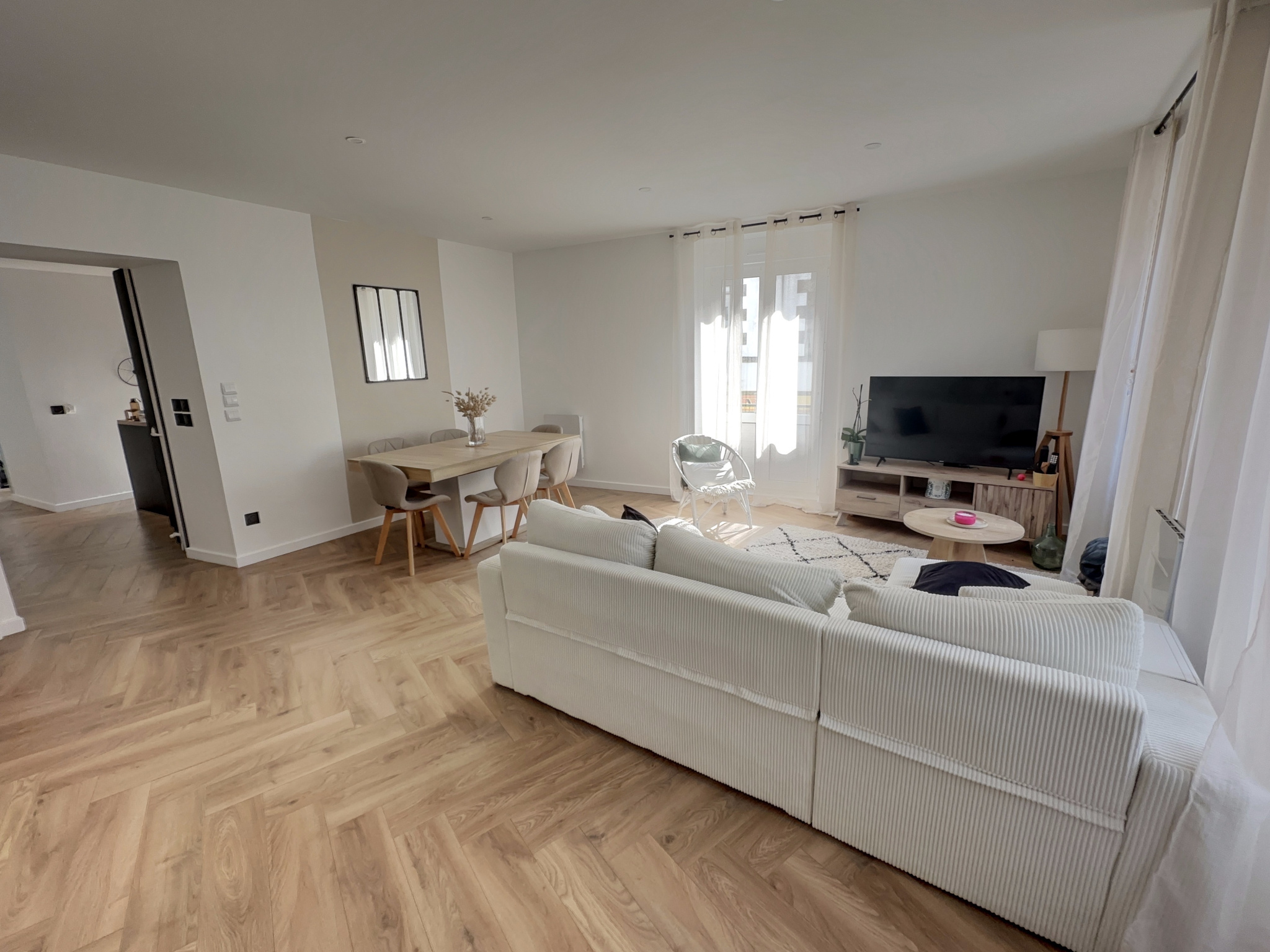 Il se compose d'une entrée desservant un couloir menant à une cuisine aménagée, d'une agréable pièce de vie spacieuse et lumineuse regroupant salon et salle à manger, de deux chambres avec placard, d'une salle d'eau avec rangement ainsi que d'un WC séparé.