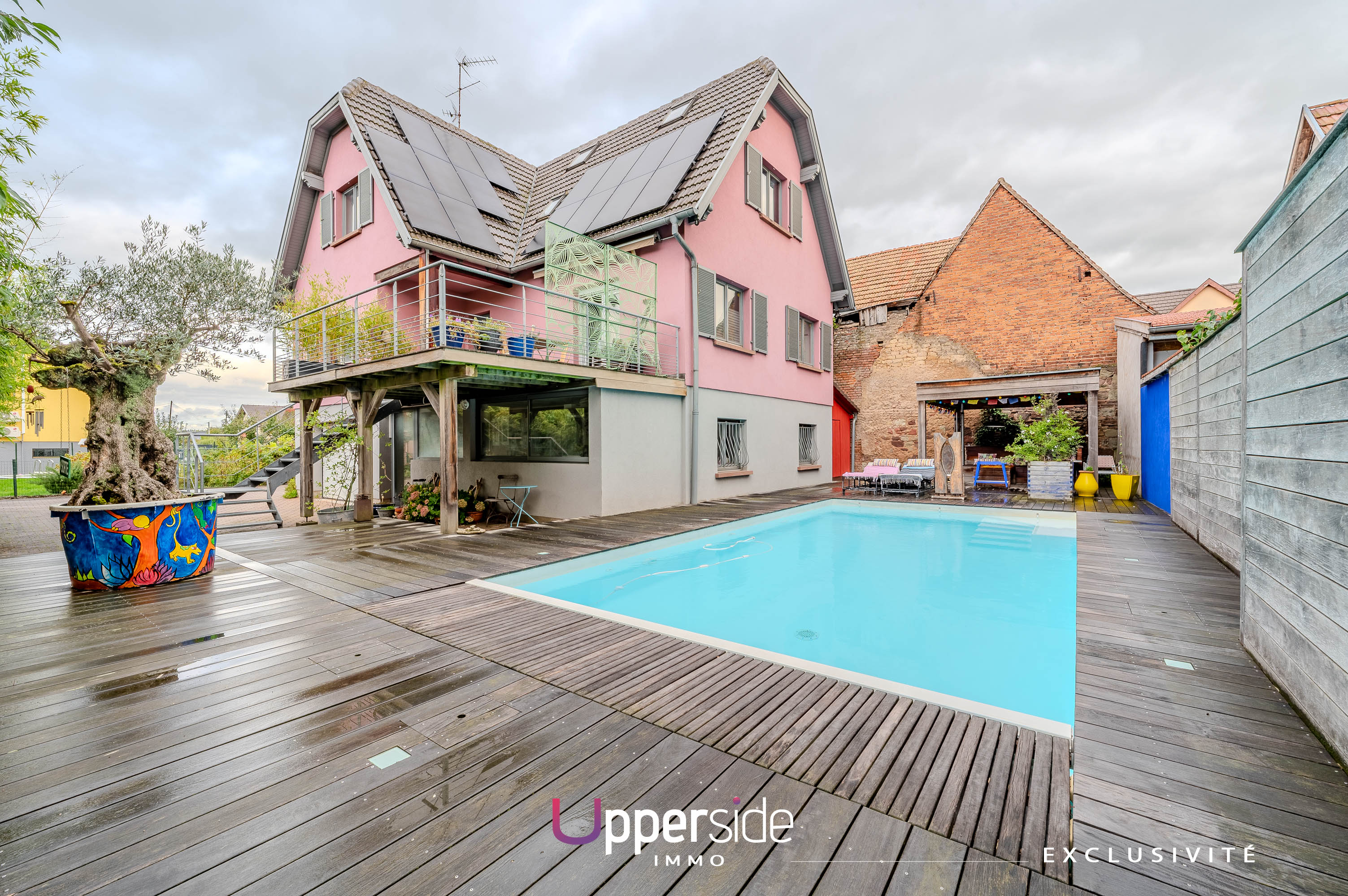 Son atout phare : une immense terrasse en bois exotique de 150 m² intégrant une pergola et une piscine (chauffée par une pompe à chaleur) et complétée par un boulodrome. Un véritable espace de loisirs et de détente à ciel ouvert.