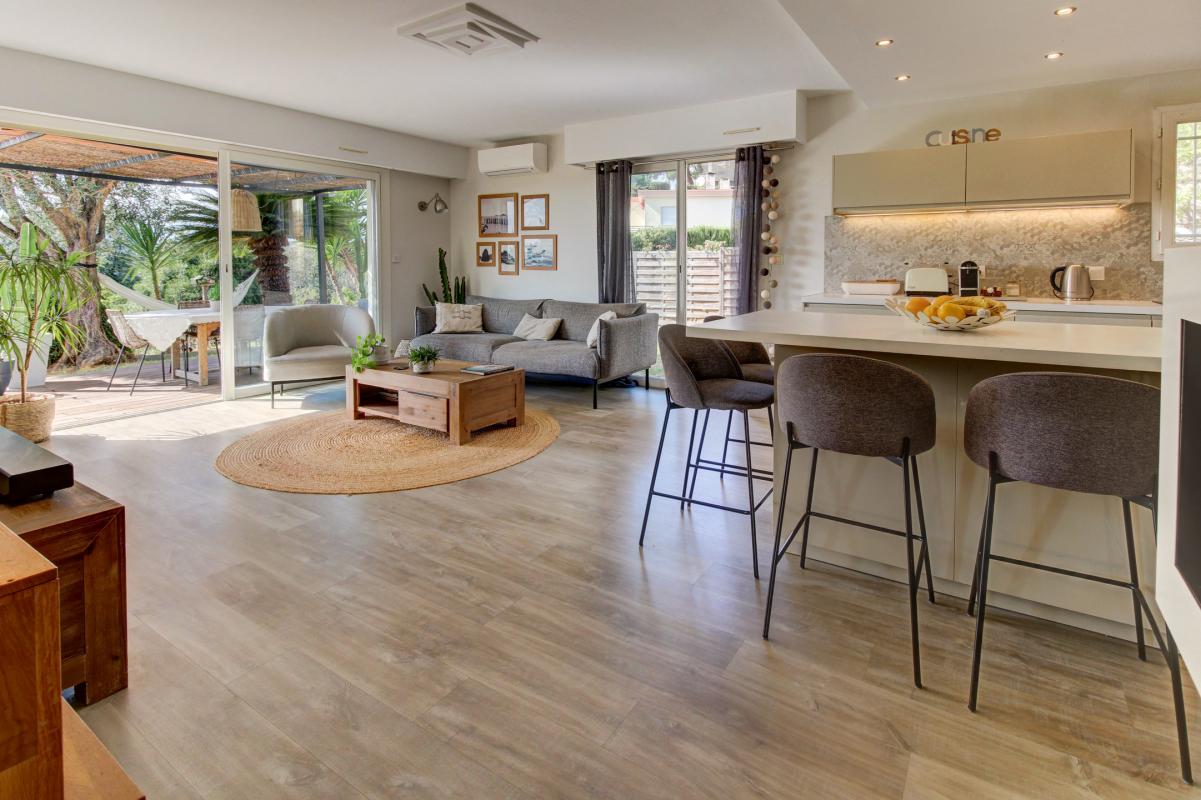 L'appartement bénéficie d'un beau séjour lumineux grâce à ses larges baies vitrées, complété par une cuisine américaine aménagée et équipée, offrant un espace convivial et fonctionnel pour la vie de famille.