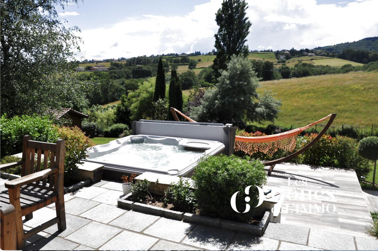 A l'extérieur, un vaste jardin arboré, sans aucun vis-à-vis. 2 terrasses : l'une donnant accès directement à la maison, la seconde équipée d'un jacuzzi avec une vue imprenable sur le vallon du lyonnais. Vous disposez également d'un grand garage double, de 2 abris voitures, d'une cave et d'une buanderie.