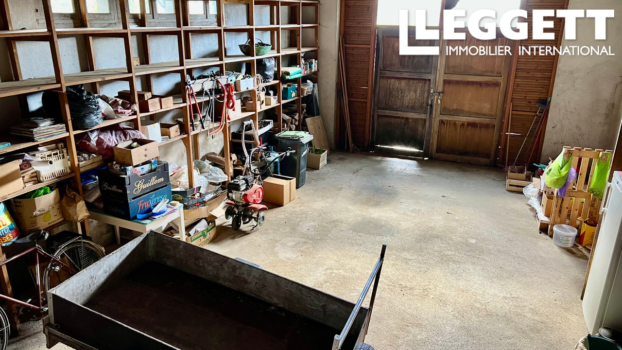 Un grand garage/atelier attenant avec des portes doubles et une grande hauteur sous plafond.