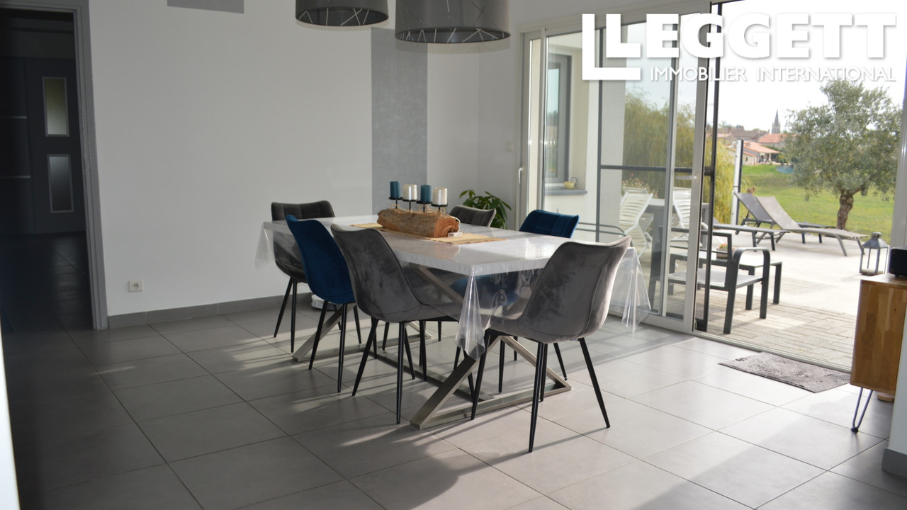 Elle se compose d'une entrée, d'une cuisine équipée avec cellier, et d'une vaste pièce à vivre (salon/salle à manger) baignée de lumière ouvrant sur la terrasse et la piscine bâtie 4m x 8m au sel. Un bureau.
