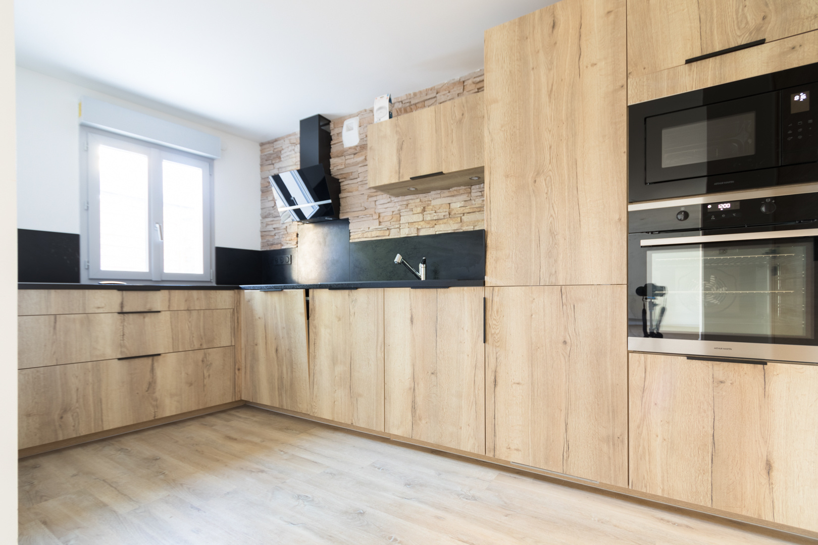 Cuisine équipée ouverte sur une pièce de vie conviviale
