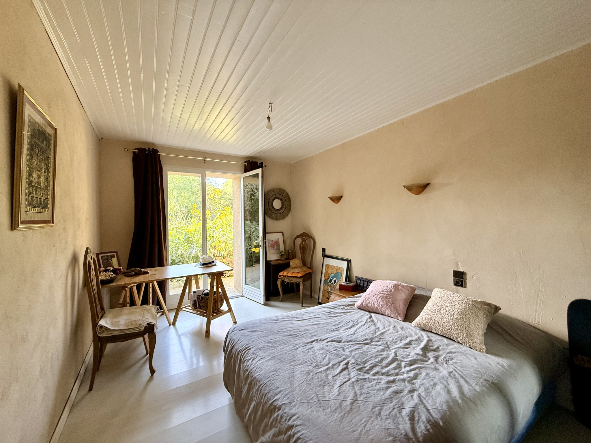 À l'étage, la maison révèle une personnalité singulière : une mezzanine aux allures de dortoir, une chambre en enfilade et une autre sous pente, offrant une disposition originale des volumes intérieurs qui pourraient aisément être retravaillés à moindre frais.